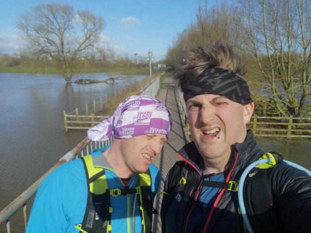 Another thing we really haven’t prepared for is the damage 41 miles of canal path and concrete is doing to our legs and feet. Usually we run trail Ultras which I prefer way more than anything road or canal based. We both begin to really suffer about a marathon distance in, with seriously sore knees and feet. Just to make things even more fun the river from Stafford onward and for the majority of the route has burst it’s banks because of heavy rain, and we spend a good few miles literally running through river. Even though I have to admit this does break up the monotony of the canal paths a bit! In fact it’s probably my favourite bit of the race so far.