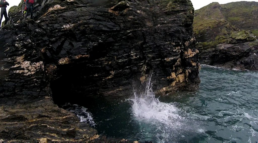 Eventually after climbing up and jumping off some smaller rocks as practice, we pass through a small arch in the rock and the guide gets us to climb up a rock stack which is about 15 or so metres high. I have to admit at this point I’ve definitely got the nerves as we have to kind of throw ourselves up and over the clear the rocks on the way down. Being as I’ve just hit 35 if I do kill myself then I’ve had a good run is what I’m thinking to myself as I launch myself over the rocks and down into the churning blue green water below. As I plunge down into the sea I realise I should have been blowing out through my nose as I jumped because I’ve just slammed a pint of the North Sea up my snozz. I swim out of the way and up onto the rocks just in time for the fun view of the rest of my mates smacking straight into the ocean.