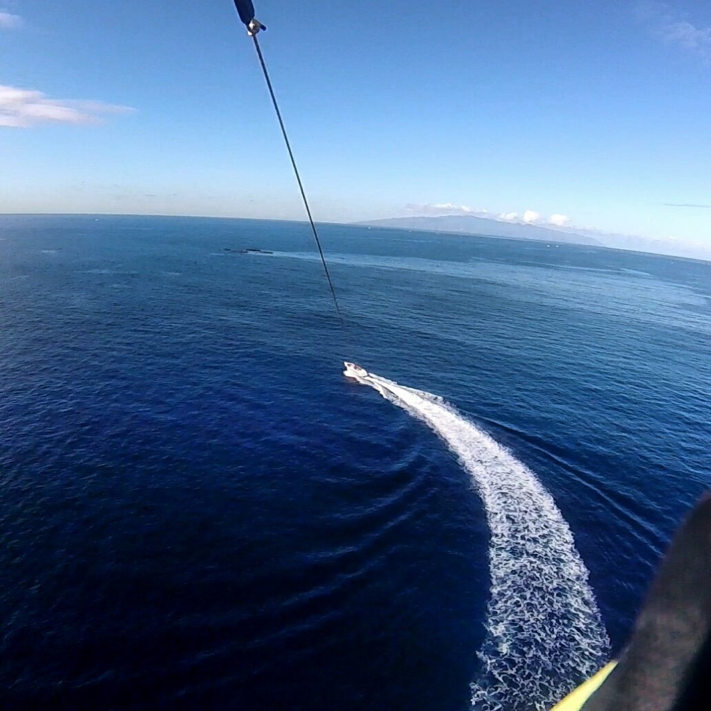 When it comes to our turn we are asked to sit down on the back of the boat. The driver clips us into a huge harness thing and me and Matt kind give each other a look of ‘what have we done’ before the guy pulls off at high speed. We rise far more slowly into the air off the back of the boat that either of us expected. Crazy thing is when you get used to it (maybe it’s just me) it’s actually kind of relaxing hovering high over the ocean, getting the full view of the island, with the boat below looking like a toy. In fact I’m actually struggling not to fall asleep because of the weightless sensation.