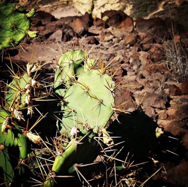 There’s no fences through and I can see a faint trace of a trail heading up through the volcanic soil and Cacti. It’s not long until I’m just surrounded by desert dry rocks, cacti and the ocean on my left, rocky and wild without any more fake beach. I can see a rugged cove just down below so I start heading down towards it, watching lizards run off while I doge evil looking prickly pear cacti jutting out of the desert dry soil.