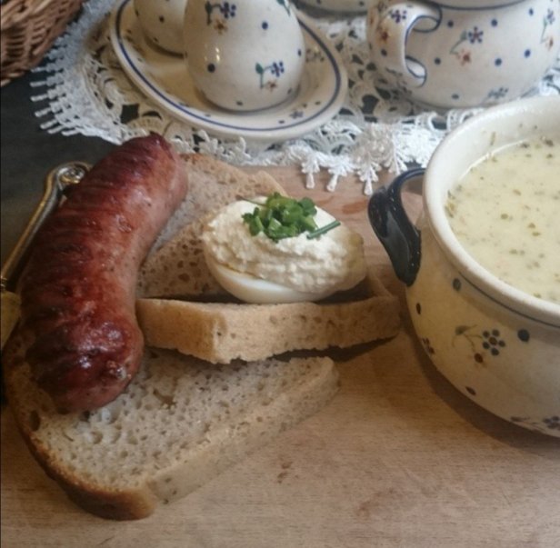 We haven’t been here for long but after reading about it before we came I fancy trying traditional Polish food, so we head out to a nearby restaurant where we are served by ladies in traditional polish dress who look like they just strolled out of medieval polish times. This place also has a weird kind of feeling of being in someones grandmas house, maybe it’s the knitted cloths and stuff on the table. One thing I’ve been dying to try is Pierogi which are polish unleavened bread dumplings, in this case pan fried in butter and topped with crispy bits of bacon, served on a bed of fried shredded cabbage. This of course is the worst thing you could possibly feed Matt because the lads a walking fart factory and we have to share the same air in the apartment. These amazing tasting crispy dumplings are one of things I’ll most miss about Polish food, I’ve tried having them from the Polish aisle in the supermarket here and Polish shops but it’s just not the same. I also try sour rye soup “Żurek” (also known as ‘hangover soup’ which makes more sense if you have tried proper Polish Vodka) which is a pretty unusual flavour as it’s made with fermented rye flour. Sometimes it’s also served in a bowl made of hollowed out bread, which sounds like a great idea. More carbs! However mine, as with most things in eastern Europe also comes with more bread, mustard and some sort of sausage.