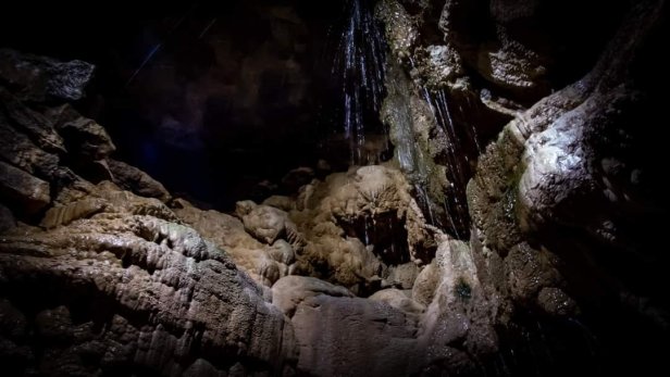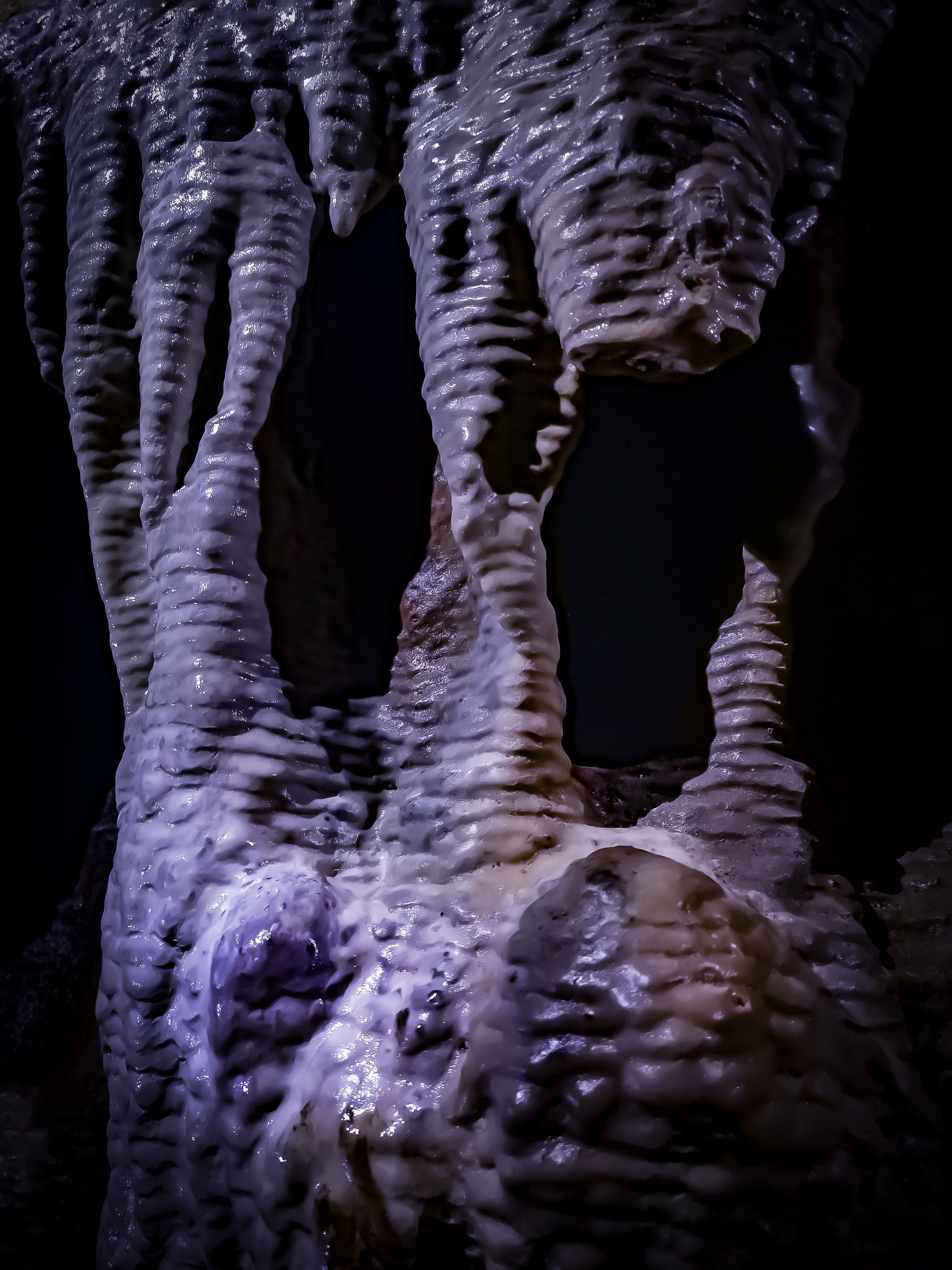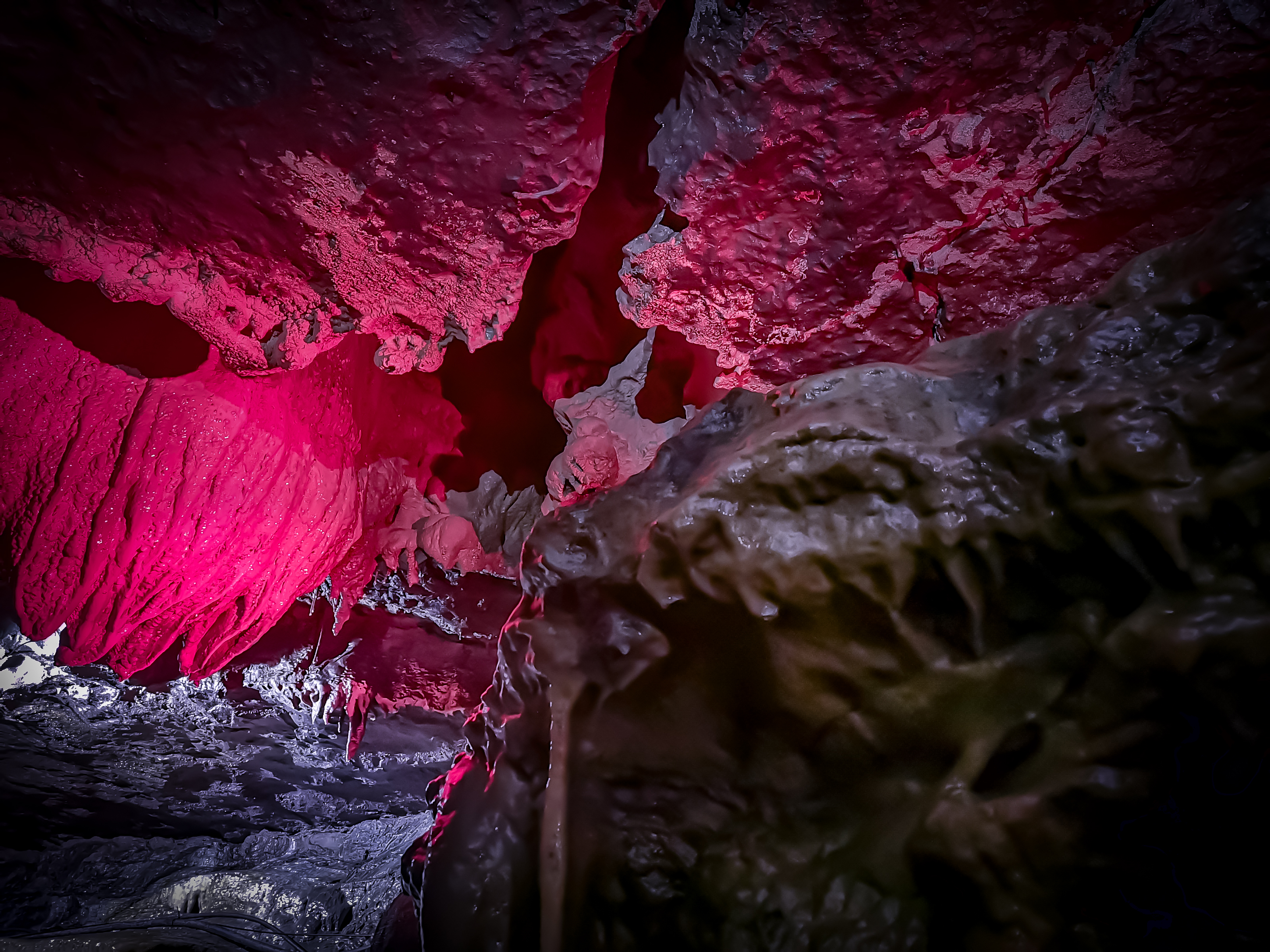 We see prehistoric mud pools which have set and cracked and have never been disturbed by man which look like crazy paving, sitting under hundreds of stalactites.