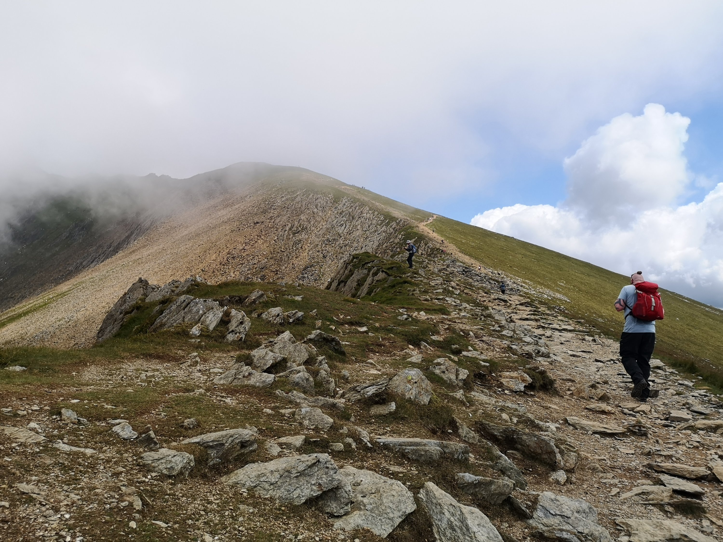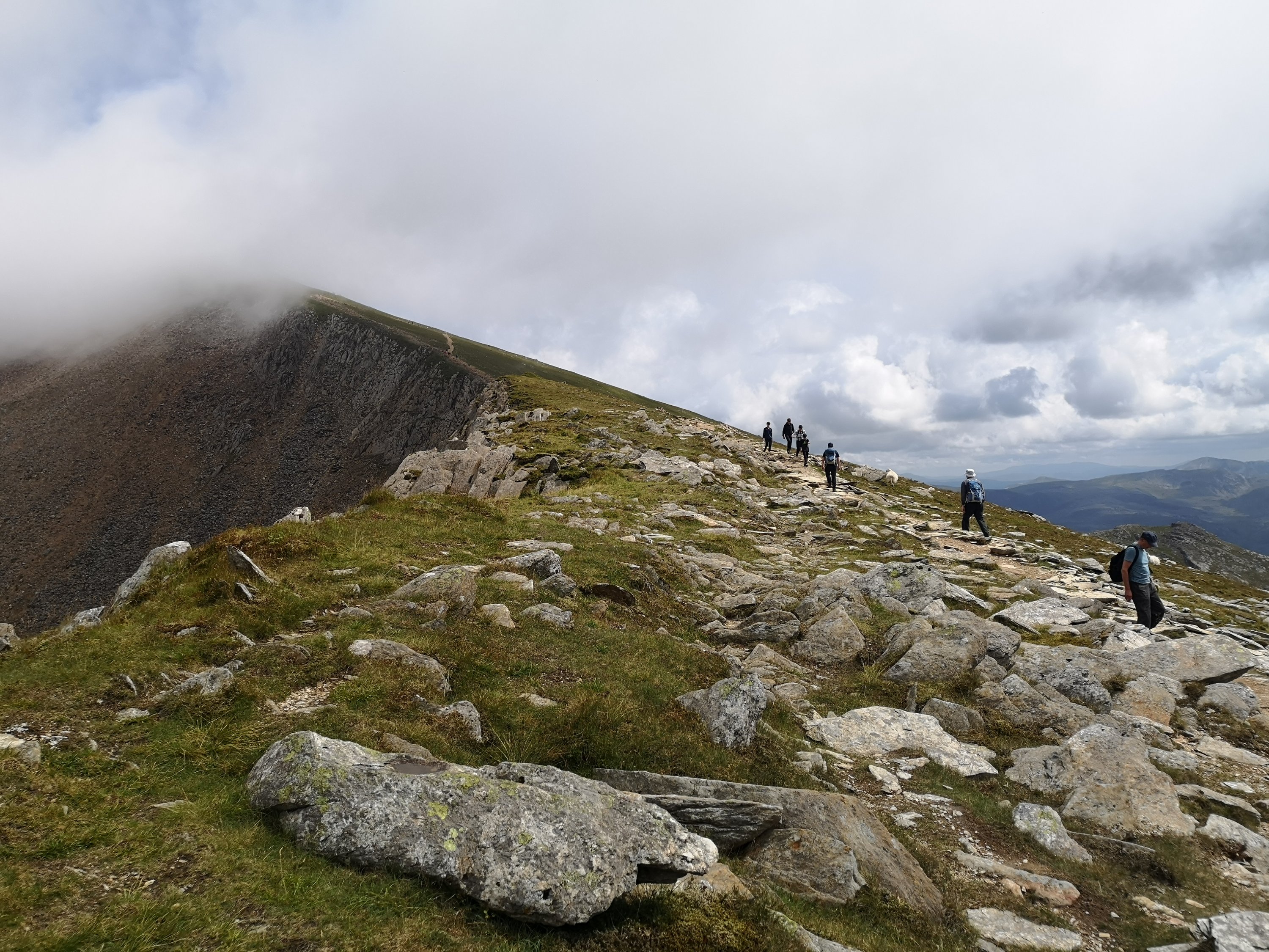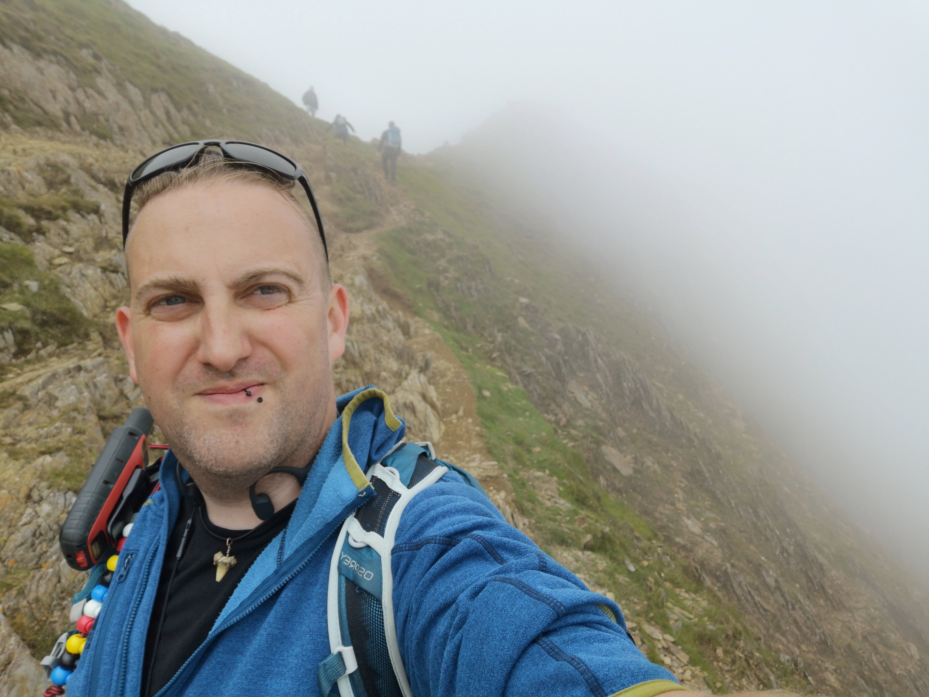 Because Snowdon is a mountain that is popular with tourists, especially due to the train that can take you from the town of Llanberis to just below the summit it’s often underestimated. Around 375,000 people hike to the summit every year, so it is a busy mountain however only around 1% require assistance from mountain rescue. However small that 1 percent may seem that’s still around 3,750 call outs a year. My personal feeling on it is that people seem to quickly forget that just because in some ways it’s more accessible that it’s still the second highest mountain in the UK. Also it’s still a mountain and it still has plenty of hazards, which not everyone seems to consider. We see plenty of people in footwear and clothing that if the weather were to suddenly change as it has want to do on mountains they would quickly find themselves in trouble. The most notorious area of Snowdonia is Crib Goch ridge, a place where many people find themselves in trouble and a lot of tourists have actually died. There’s also a strange mentality of ‘well my mate did it in a pair of trainers and no waterproof jacket so i’ll be fine’. Getting away with doing something badly and dangerously does not make it the right approach, it just means you didn’t fall foul of natural selection this time round. These days you are more likely to bump into a herd of unicorns than find people with much common sense. Standing at 1085m high, some people refer to the place as Mount Snowdon however the name Snowdon actually means ‘snow hill / snow mountain’ so that doesn’t really work because you are effectively calling it ‘Mount Snow Mountain’ . It’s welsh name is Yr Wyddfa Fawr, which translates to the Great Tomb or Great Throne in English. It has also been previously known as Carnedd y Cawr, or the Cairn of the Giant which feeds into one of the many myths and legends associated with Snowdon. We have plenty of stories of King Arthur in the UK and it’s said that Arthur killed the giant known as Rhitta here, a giant known for killing his enemies and sewing himself a cape made of the fallen mens beards. Which grimness aside sounds like he itchiest piece of clothing ever. It is said after Arthur killed him his men covered Rhittas corpse with large stones on the top of the mountain, which explains the ‘Cairn Of The Giant’ title. The views on our ascent as we progress along the ridge lines in this perfect weather are actually some of the most breathtaking I’ve seen in this area, and we all wonder out loud why we have never used this route before?