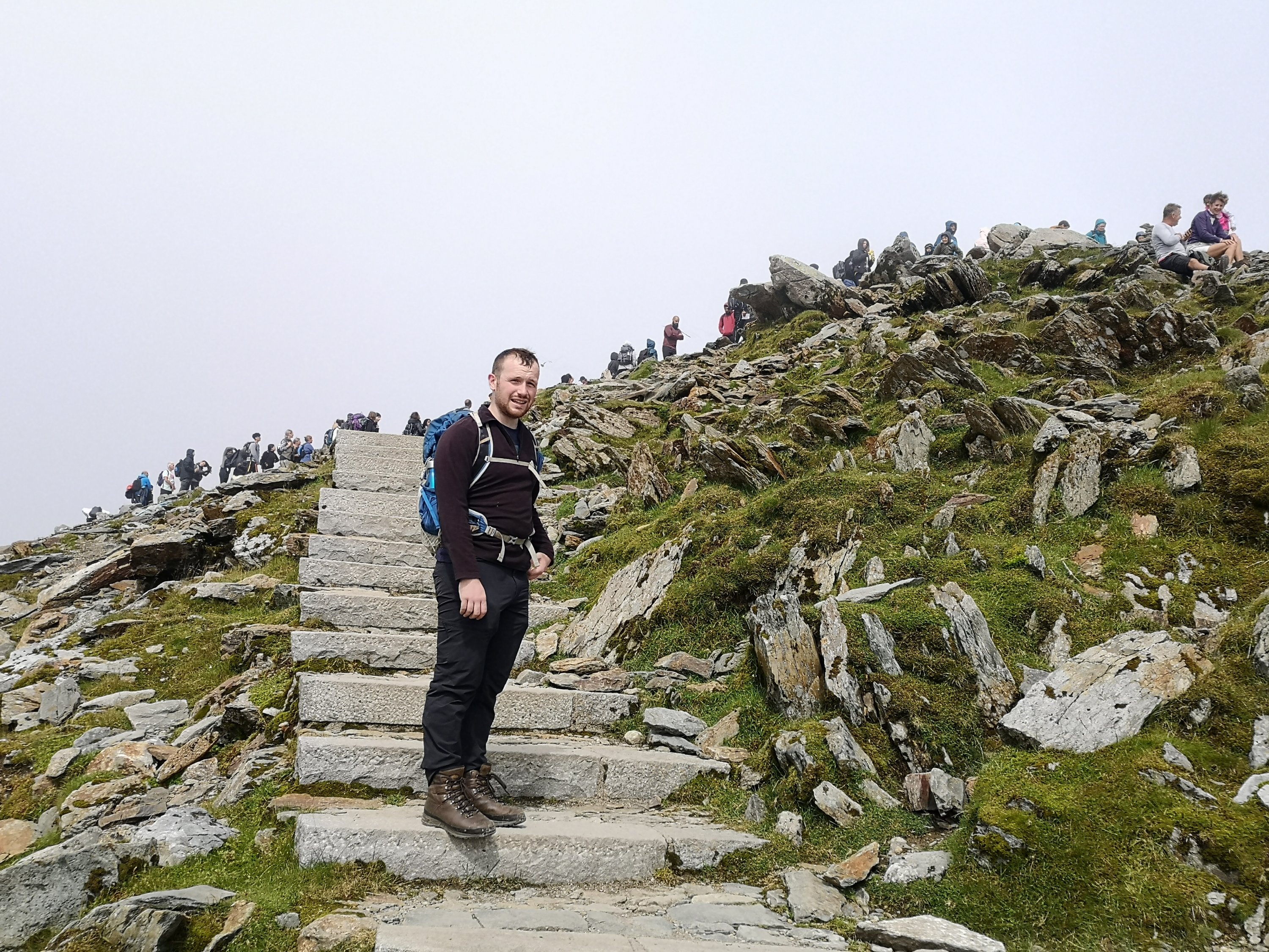 The summit is obvious even if they hadn’t built a cafe on top of the place, there’s actual queues of people waiting to take a photograph at the trig point. Usually I come outdoors, for peace and quiet and to enjoy the scenery in relative peace. These ideas are totally murdered by the fact there’s crowds up here, waiting in huge lines to take a selfie with the trig point. Luckily all of us have seen this before with far less people in the way, and we wanted Rich to see the summit as he’s never been here before. From that point of view its totally worth it to see him enjoy his sense of achievement. And it is an achievement how healthy the dudes got in such a short period, it’s impressive. Only a few months back he was looking like he was going to have a heart attack on the side of the Old Man Of Coniston. He was so red he had started to resemble a radish with a viking haircut. I get at least some enjoyment from being on the summit again as I see much to my own probably twisted amusement that there’s a legend carved into the stones here that reads ‘Here you are nearer to heaven’ and you have to appreciate the double meaning of it being literally one step from a defibrillator on the other wall! After Rich garbs a quick summit selfie we make our way back down via the Snowdon Ranger path back to our camp ground and grab some well deserved beers.