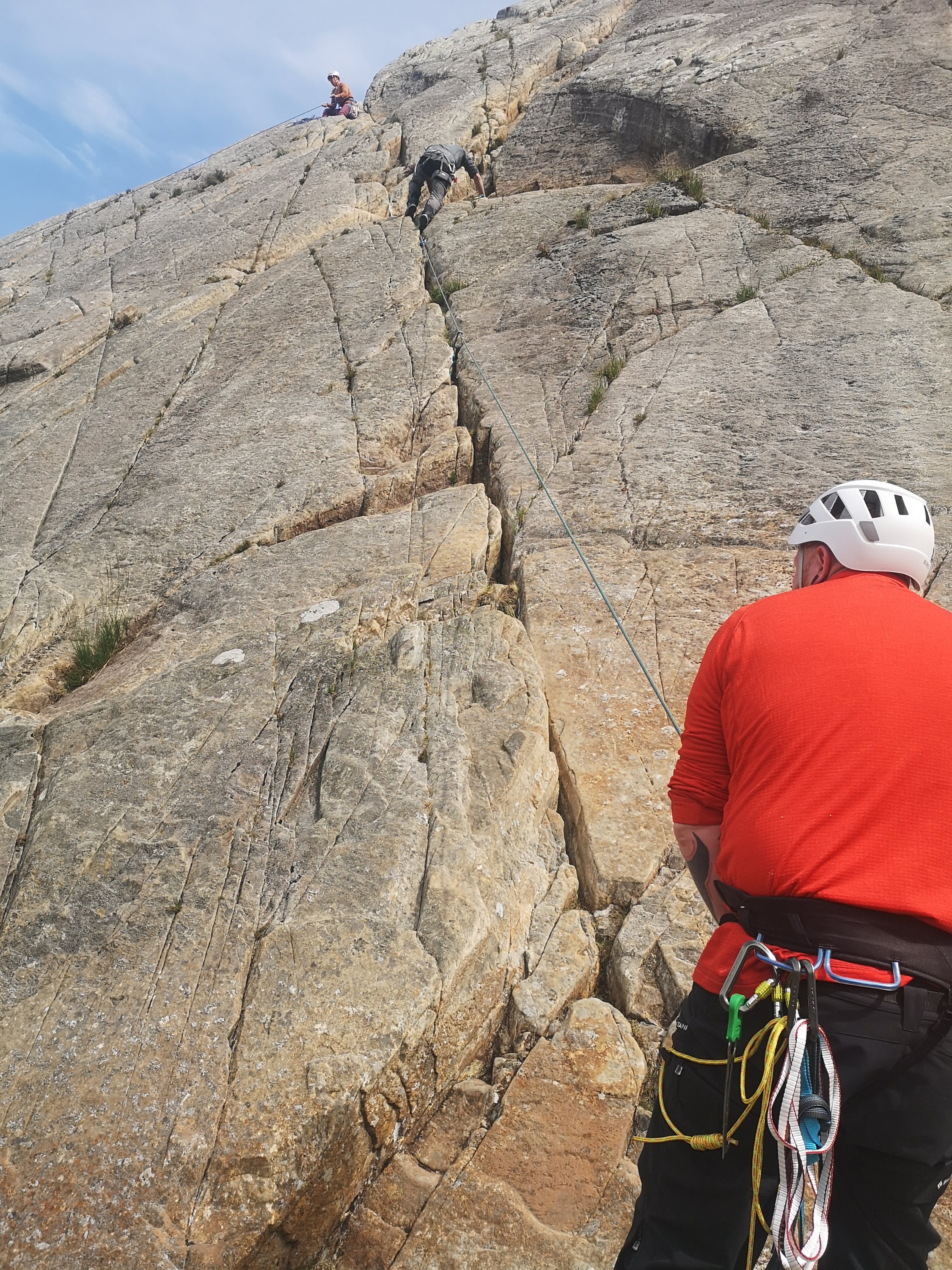 Now we get Andy and Ben to have a go at placing gear on the ground before they climb and also removing it using a nut key in this case the amusingly named ‘nut buster’ (we all know a few of those I’m sure). We then make sure they still remember how to tie into the rope set up a belay plate and buddy check. First up is Andy on the top rope and he does a good job adding and removing gear and then Ben does the same. Well apart from the bit where they both manage to dislodge one of the nuts by kneeing it at least, so all good so far! I also belay Richard up and make sure Ben and Andy are watching what I’m doing.