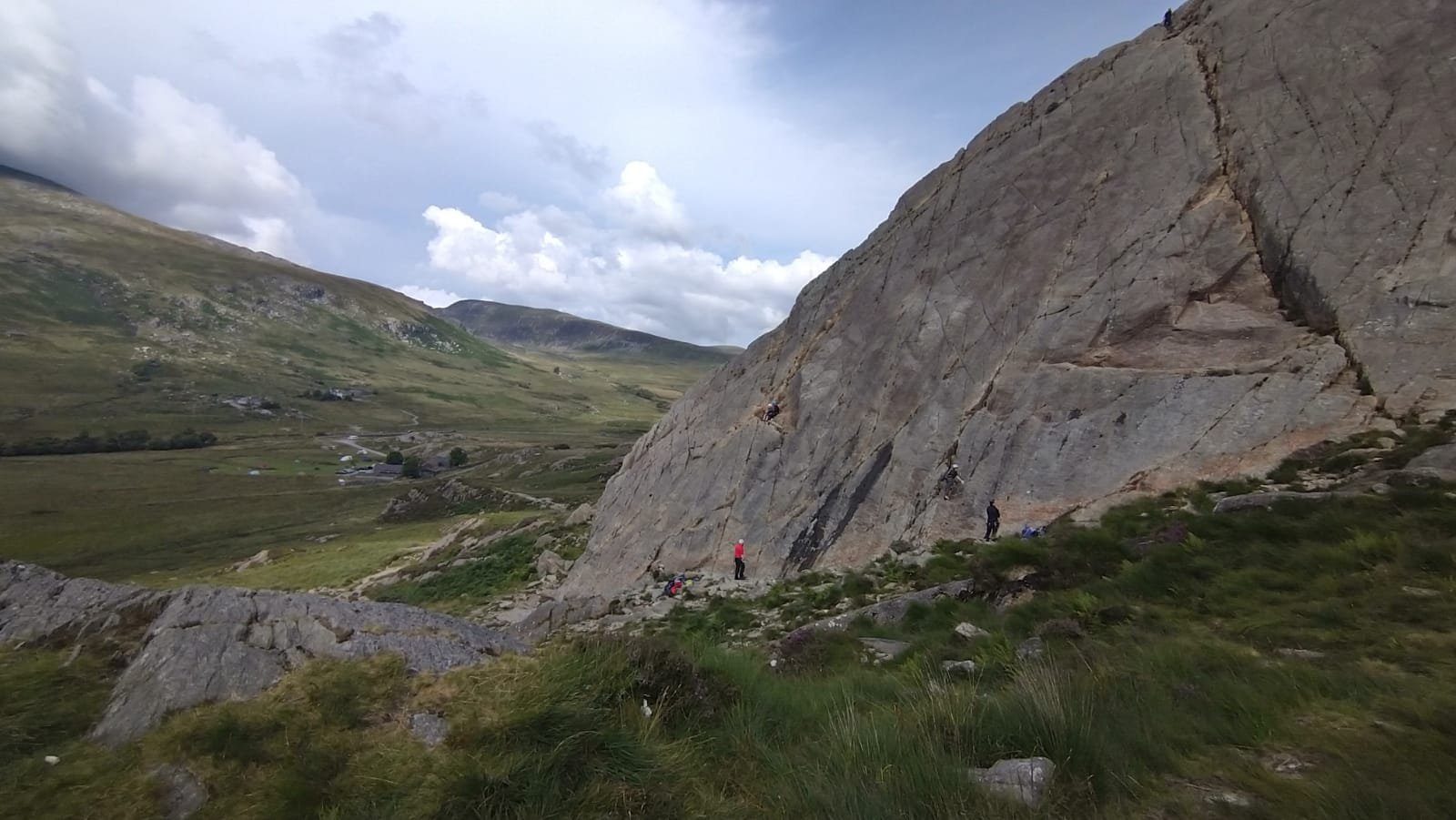 Today we are going to be using little Tryfan to practice some climbing and scrambling techniques. There will be some who know the place well for those that don’t little Tryfan or ‘Tryfan Bach’ it’s what I’d probably describe as a volcanic rock outcrop in this case Rhyolite. This slab of rock leans backwards which makes it excellent for a low pressure climb and it also has a number of easy climbing routes on it. Going for a leant back slab means we won’t tire our arms out easily and we can calmly take our time climbing and practicing putting the gear into the rock. There’s far less pressure, and hardly any chance of falling though this still doesn’t make it any less high than it is!