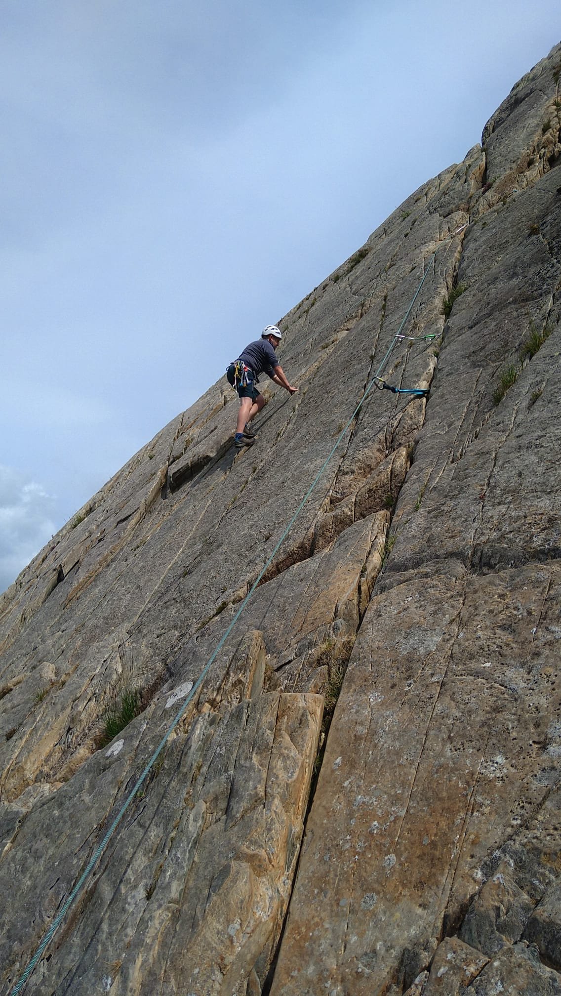 After ramming a pork pie down my pie hole (for the non UK readers that means my mouth) in what I’m classing as my lunch today, because I tell myself ‘I’ll burn it off’. I set myself up at the foot of a bit of small sloping slab and tie and with Rich on belay. Pulling myself up onto the slab I’m wedging my feet into the narrow crack that stretches up the rock face towards and through the ledge I’m heading for. The first bit of gear I have to put in is going to be pretty crucial, not because It’ll stop me from falling from a great height but because it might just about stop me falling from not quite a great height and maybe breaking my ankles. I glance at the wedge shaped bit of metal that’s hard to imagine as my ankle saviour and try not to think about us not having brought bouldering mat with us as I place this first bit of gear and double, triple check it even though I know it’s in a bomber placement (for non climbers by that I mean nothings going to remove it unintentionally. After sorting this and breathing a little sigh of relief I climb up past it and have a sketchy moment where I get both feet almost fully stuck in the crack in the rock and can’t get either of them out. Lucky after a bit of a sweaty palmed panic I retrieve my appendages from the wall, and climb further placing a few more bits of gear and eventually reaching the ledge I’m aiming for.