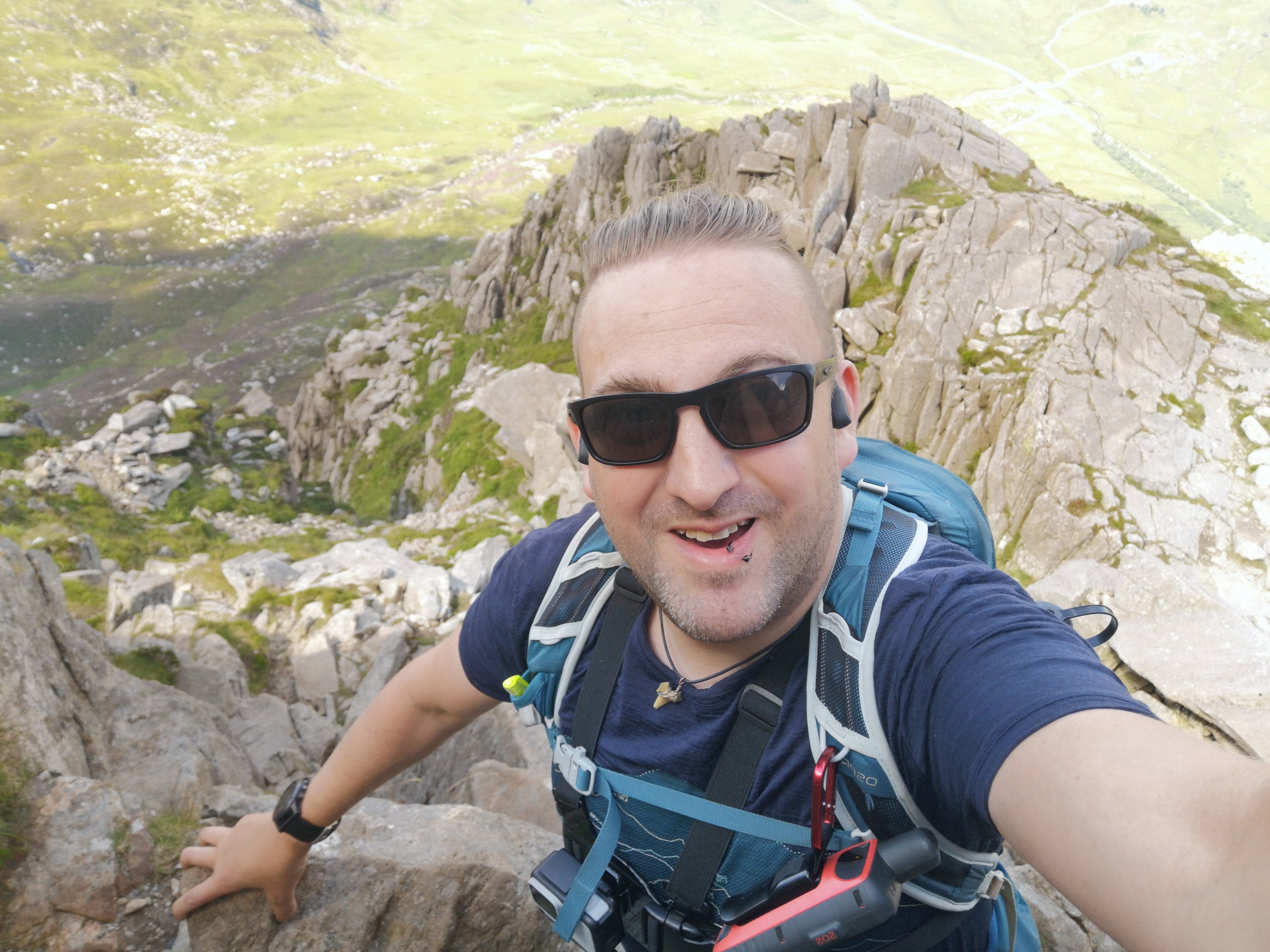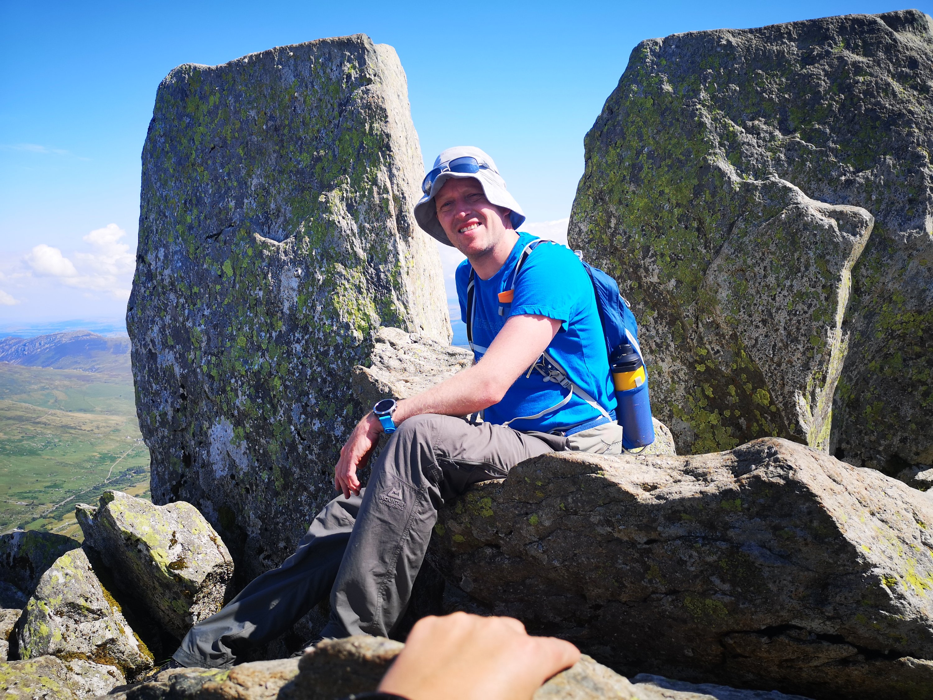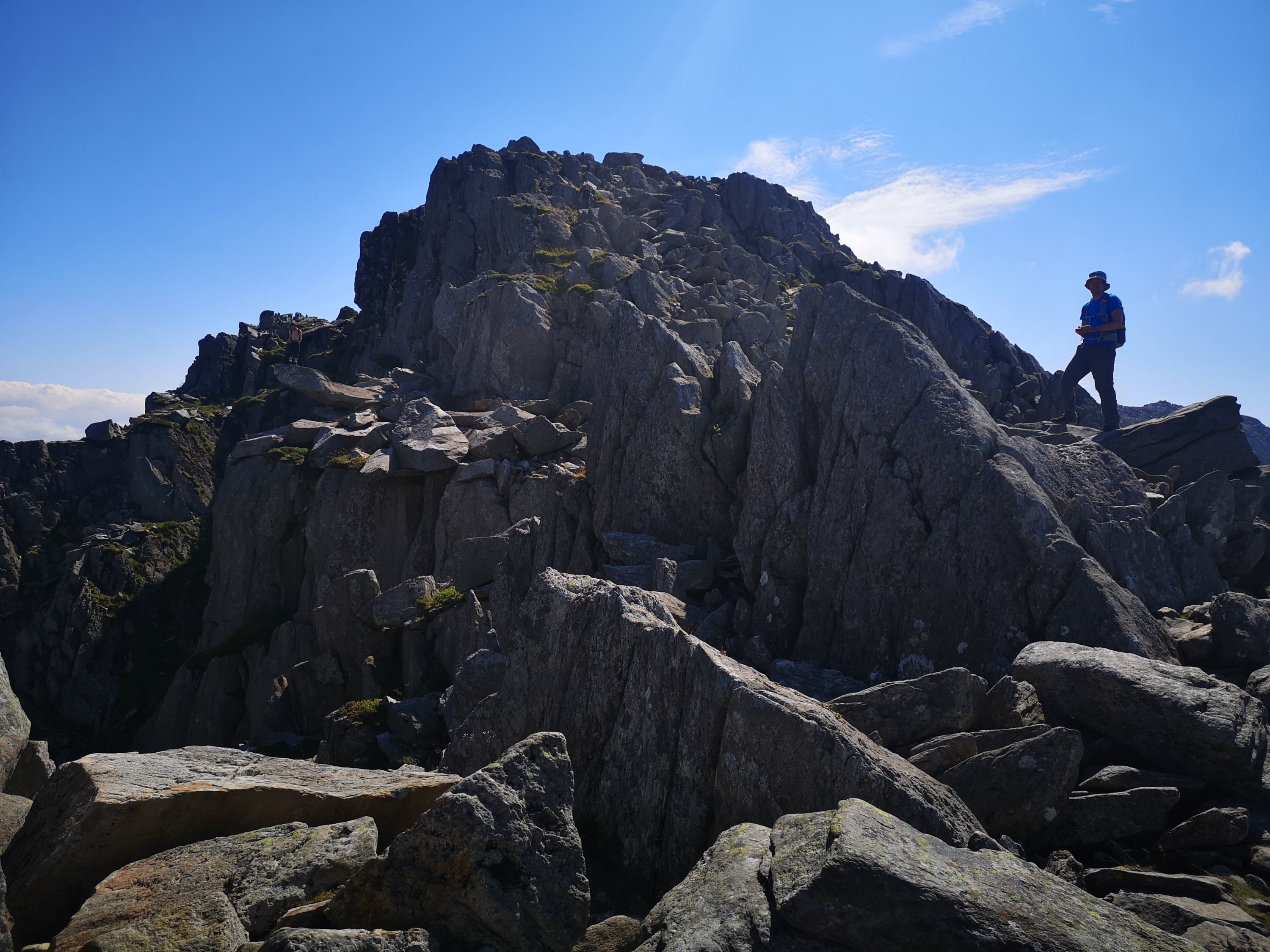 It’s clear he has proper shat himself on this, as he shouts down in a panicked and traumatised voice that neither me or Andy should attempt what he’s just done unless we are really really confident. You can hear the panic in it, like a goldfish thrown in a shark tank.It’s clear he has proper shat himself on this, as he shouts down in a panicked and traumatised voice that neither me or Andy should attempt what he’s just done unless we are really really confident. You can hear the panic in it, like a goldfish thrown in a shark tank. In fact at this moment Im looking up to make sure that there’s not a steady stream of wee making it down the rocks in our direction. I was confident about the ascent until he came out with that absolute diamond of a sentence, and this is not what me and Andy needed to hear at this point as whatever confidence we had is blown away like the seeds you get on the head of a dandelion. He’s gone and planted a seed of doubt in both our heads, and panic unfortunately is infectious. If you panic you become a danger to yourself and to others, and where before I’d have just started climbing up the rock face now I’m second guessing myself. I make a mental note that in future I need to ensure with groups I lead in future, that I don’t let others take over as leader. It’s my own fault really for giving up and letting him plow ahead navigating, he always seems happier with a map in his hand. I have learnt a useful lesson here though because he didn’t know his abilities well enough here and the same for back at Idwal. We can all be guilty of underestimating some climbs up until we are actually on the thing though and It does highlight I’m going to have to get better at learning peoples abilities for future groups. If I go first in future I’ll install confidence in the rest of the group and, well if I don’t I guess it a good job me and Andy carry first aid kits and an emergency beacon. On the plus side at least Ben followed through and got himself out of his scary situation so well done to him, however as for me and Andy we are now going up another route. Climbing that chute with dented confidence doesn’t seem like a wise idea right now, and there’s always next time. A few easier sections later and we arrive just below the summit, and see the familiar shapes of the Adam And Eve the two huge stones on the summit which are probably the most notable feature on the mountain. Apparently the story goes that Rev Peter Williams scared his friend William Bingley by deciding to jump the gap between the Adam and Eve Rocks. This was all the way back in 1798 and started a mounatineering tradition or leaping between the rocks. The thing that makes this super freaky though is having Tryfans several hundred feet drop of an East Face, at your back while you do it. I do some crazy things but honestly I’ve never fancied trying the ‘leap of faith’ as it’s known. And right now I still don’t fancy it because I can just see myself somehow messing it up, so I settle for the obligatory photo with Ben and Andy at the summit.