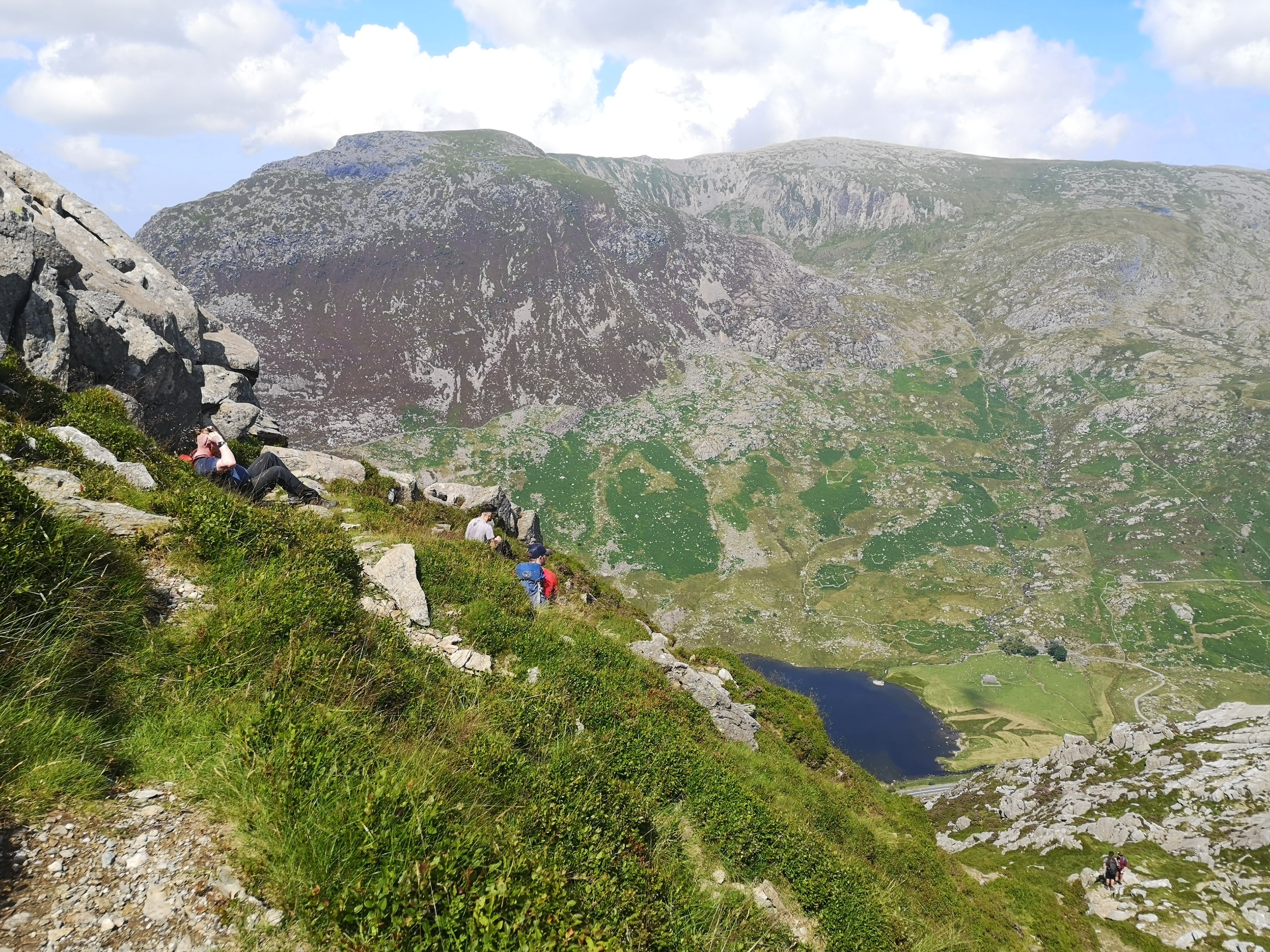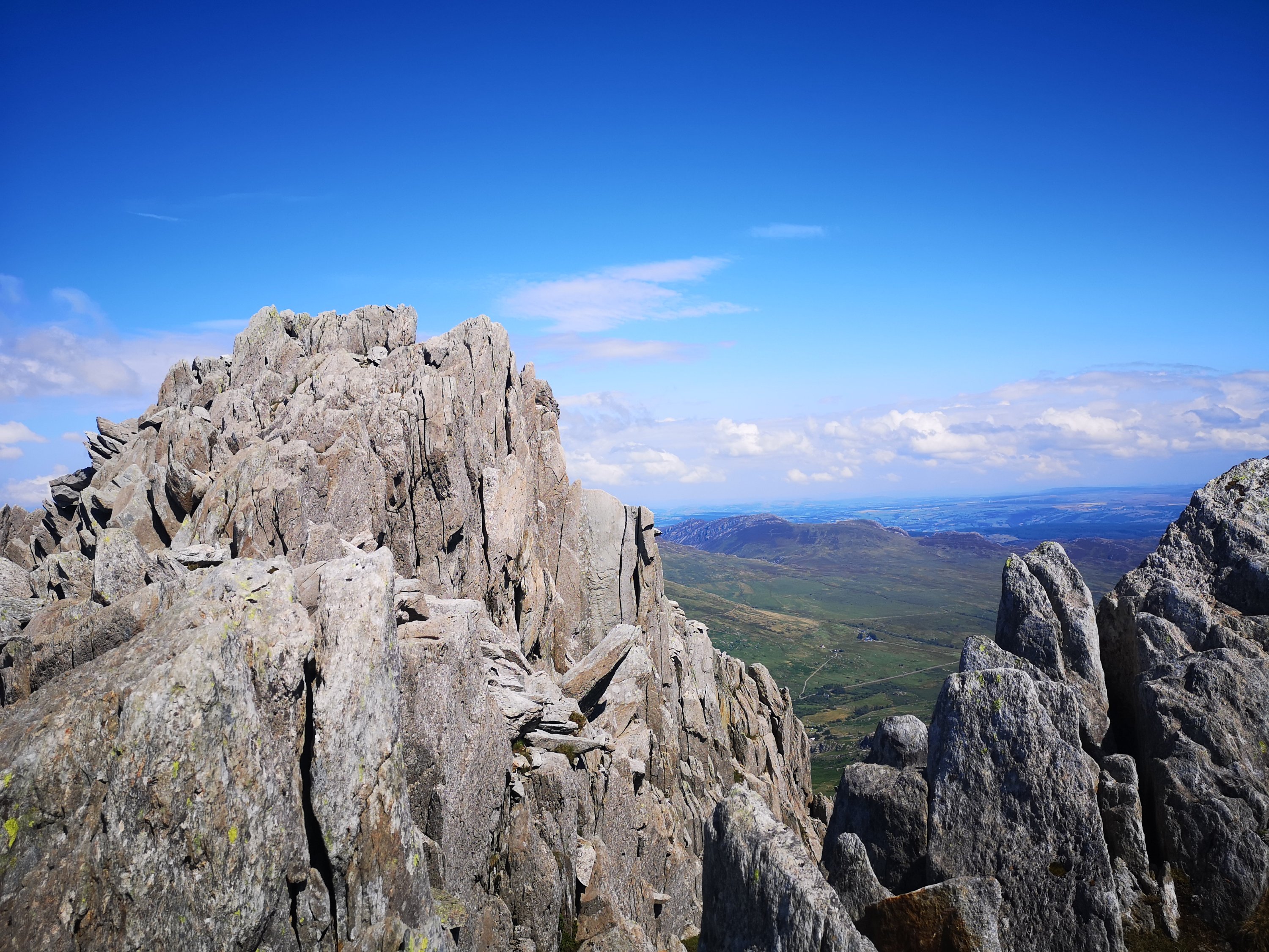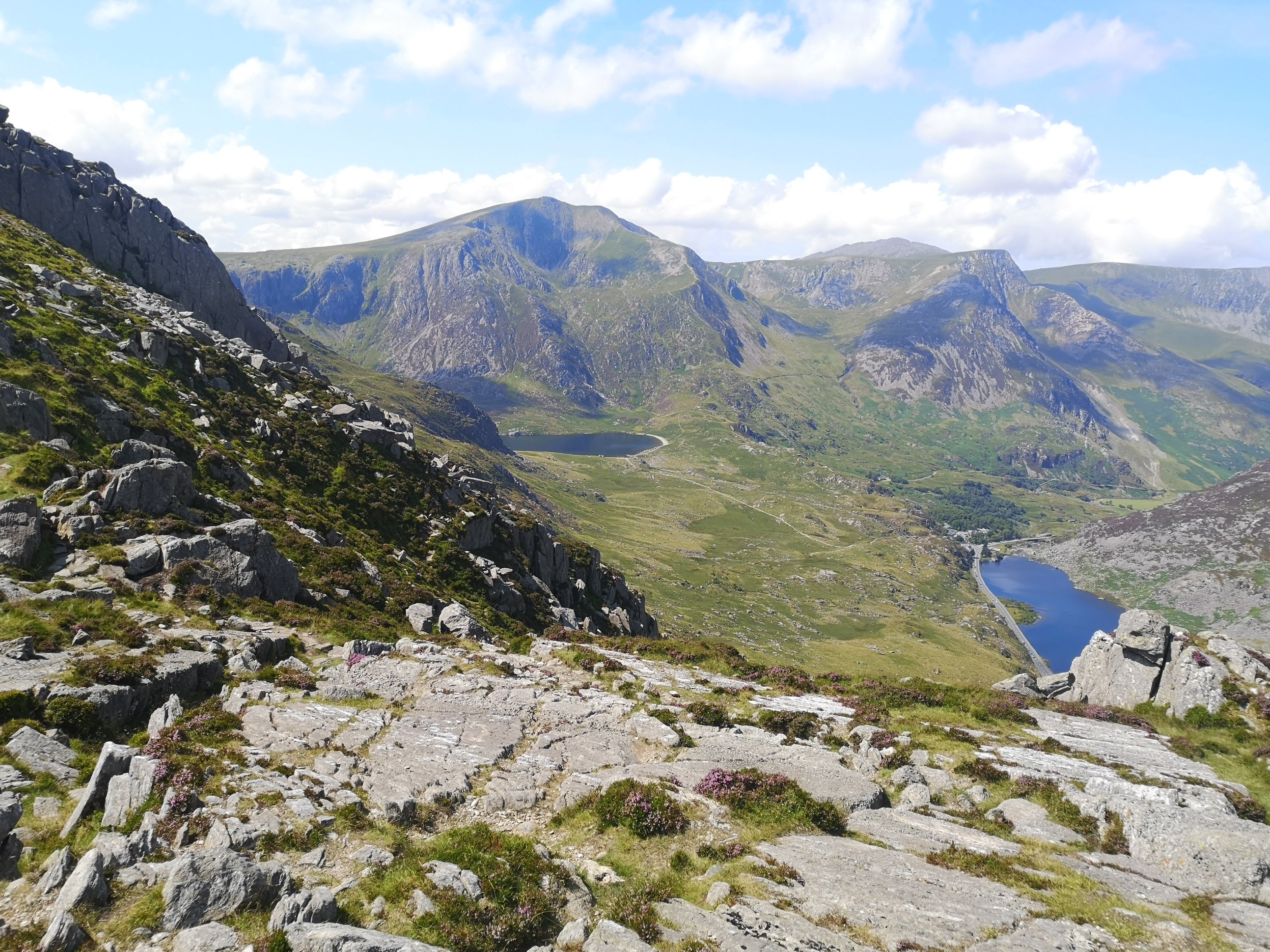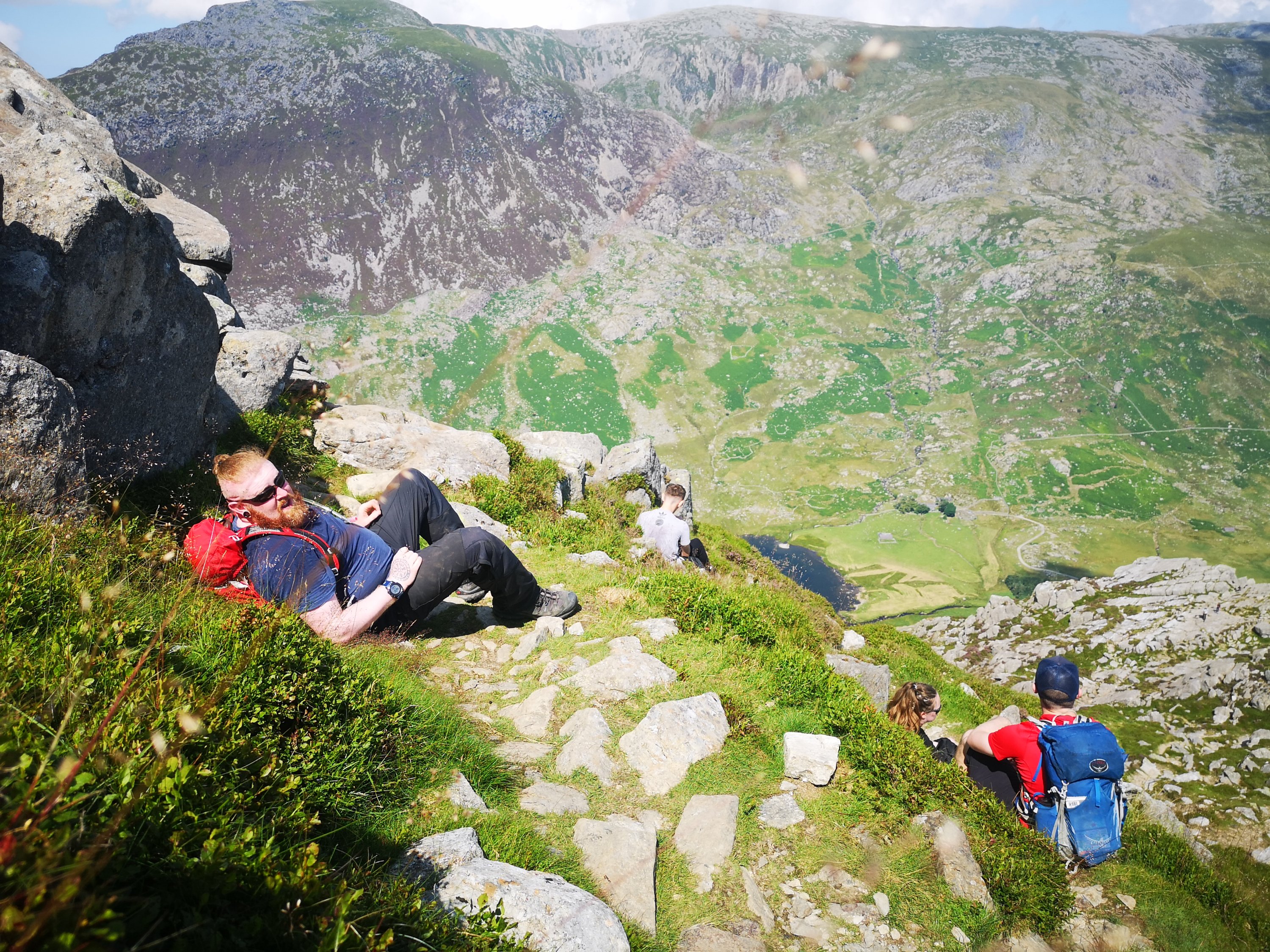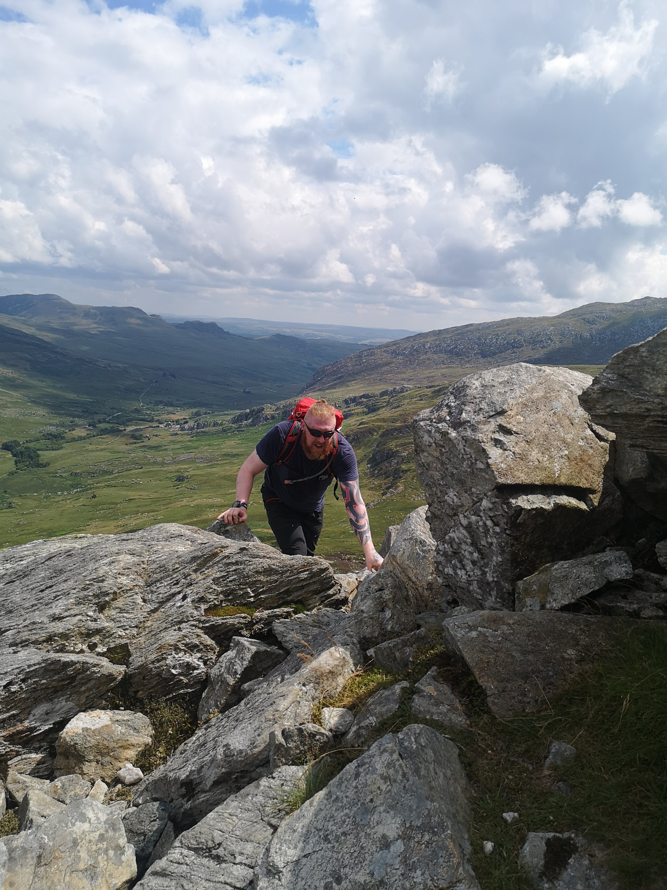 The next day we decide to do Tryfan by the North Ridge route, and we set out on yet another amazing day for weather. Tryfan is classed as a ‘Scramble’ which means that no matter how you approach the summit you are going to end up doing either some easy climbing or difficult climbing to reach the top. Not really one for those with issues with heights but damn it is fun getting to the top! Tryfan looks like the spine of a vast dinosaur from a distance and its name derives from ‘Tri Faen’ or the Three rocks. I also remember its shape pretty well as being a perpetual child it reminds me of one of my favourite dinosaurs (do not try and tell me you don’t have one if you grew up in the 80’s!) the Spinosaurus. We walk up past little Tryfan through the heather which is a total dick to walk through especially when the scratchy bits get stuck in your socks because it’s super uncomfortable, it also totally destroys hiking socks when you tray and pick it out. To our benefit nobody picks up any dirty bloodsucking ticks on our way through either. There are amazing sweeping views of the Ogwen Valley as we ascend and it’s not long before we get to something I had no idea was there which is a set of stone steps going up the back of the mountain.