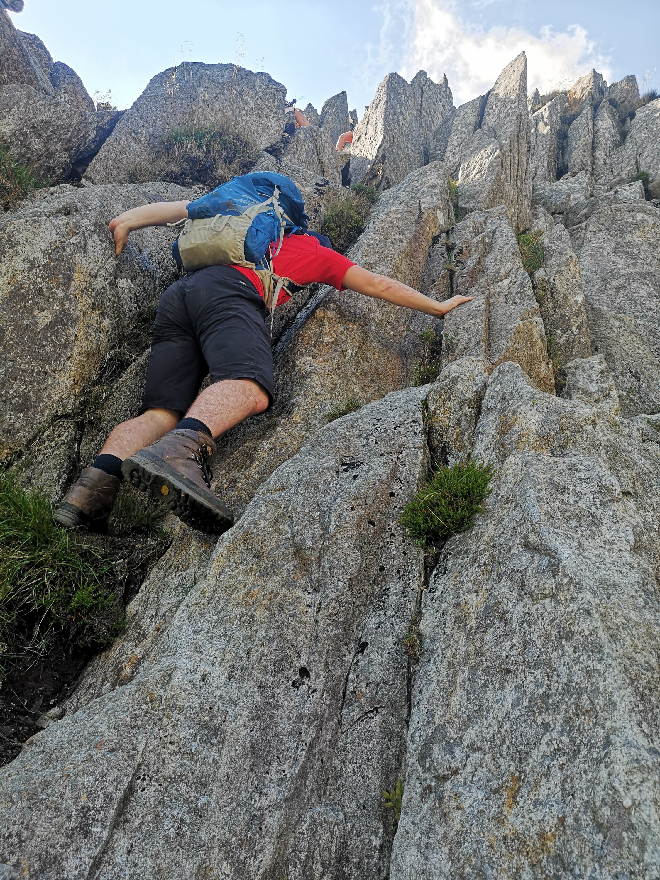 Now people who don’t live in the UK (especially friendly Americans, Australians, Canadians and a whole host of different nationalities reading this might be going ‘hey they don’t say hi to each each other anyway?’ well no not really, and if you want an extreme example if you are ever here go and sit on the tube in London and watch everyone actively avoid being sociable, like if they make eye contact with each other they will be dragged out of the carriage by the police and you’ll soon understand exactly what I mean. But no, saying hello to people you don’t know is pretty rare in the UK especially in the cities. That is unless of course you are on top of a mountain, and I don’t know why but they seem to bring the best out in people. Anyway the two we’ve picked up are Hayley and her friend Dylan and we chat to them as we make our way up to the summit. They haven’t really got a clue where they are going which is fine because they seem pretty friendly. When we get a bit further up the terrain becomes a lot more technical and having been a bit starved of actual scrambling this trip I want to take the more difficult way up. So this bit is where we hit the issue, with this mountain it is as hard as you want to make it. If a route looks hard it probably is, if it looks sketchy it probably is. The guys who have joined us are beginners and Rich isn’t so confident but Andy is. I know Rich can navigate ok and I know in this kind of weather with a good forecast he should be fine, so he takes what they think is going to be an easier route with the new guys and me and Andy and Ben head up what we think is going to be bit more challenging. This was really the point I should have thought of the previous day and either sent Ben with Rich or just kept the group together
