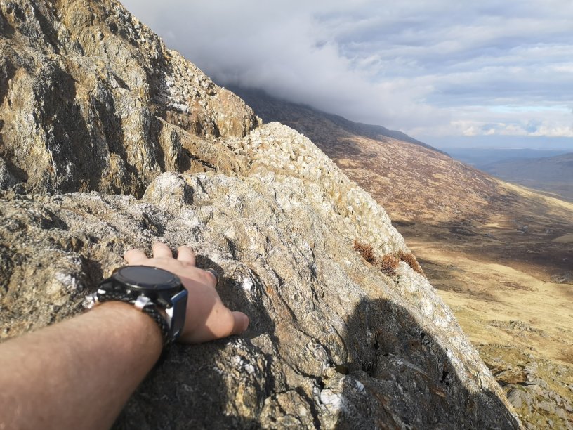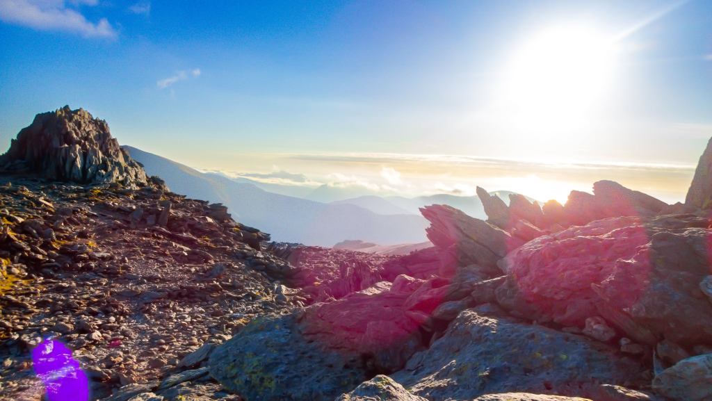 Getting myself back together and now paying more attention I start heading Northwest towards Glyder Fawr via the rocky outcrops I’m seeing on the maps, thinking i’d rather do a bit of scrambling than trudging through boggy ground again. I’ve only recently learned that the mountains name is pronounced ‘Gleyder Vower’ and not ‘ Glider Fower’, then again I’m only now getting to grips with how to say certain places so the welsh people I meet know what I’m referring to.Soon enough I reach the crags and can see because not many people come this way the rock is still really rough and very grippy. Soon I’m scrambling up the rocks, with the sun beating down and a huge smile on my face because I can see the hostel off far in the distance now looking tiny. Because I’m a child I stop for a moment to pretend to squish it between my fingers with the perspective. Squidge!