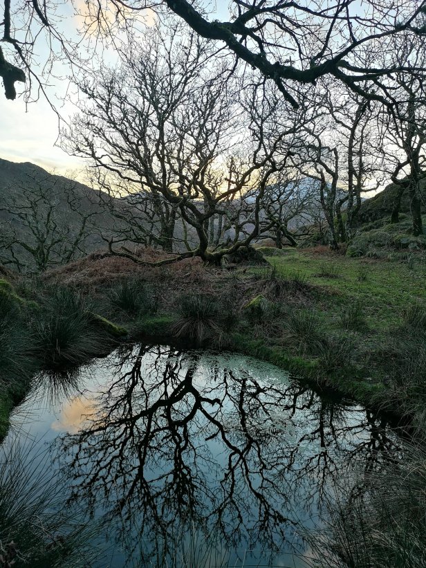 There’s something special just in the way this place feels, I’m not sure if it’s something deeper and unexplainable or just the way this hill fort overlooks the spectacular scenery of a large part of Snowdonia, the Glasyn river valley. It does easily resemble something you’d see in a televised fairy tale, which the gnarled old trees, the mountains in the background and the small pond reflecting the nearby trees like a perfect mirror in it’s currently still surface, looking like a possible portal into other world.