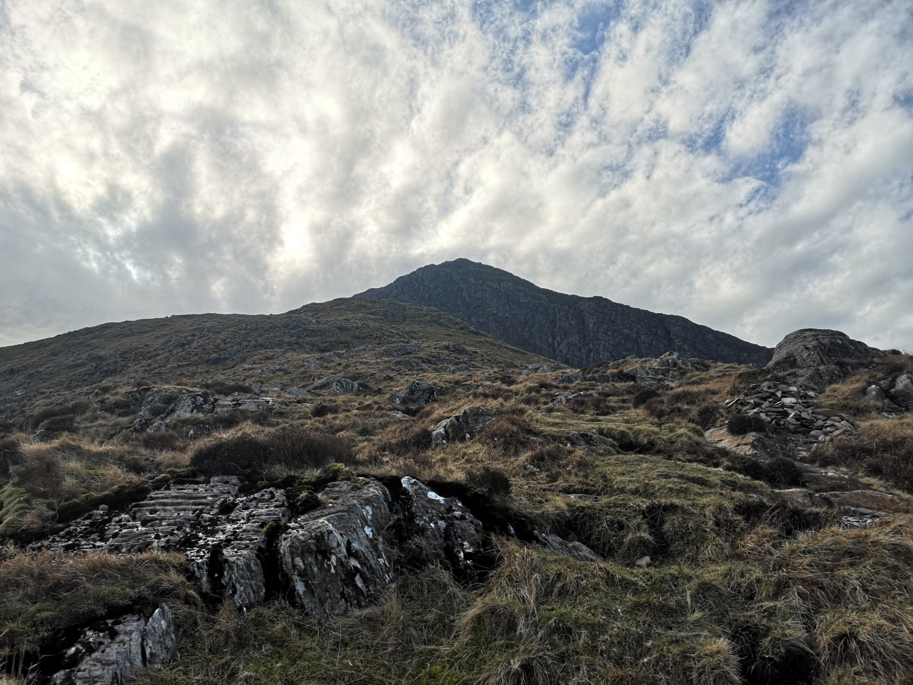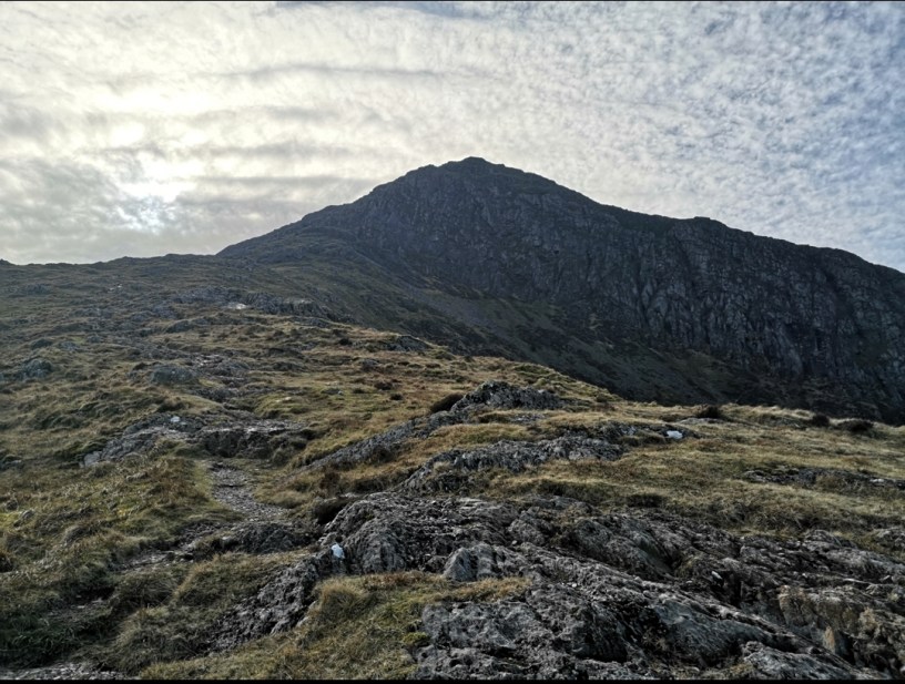 I’m heading up moel hebog, which is welsh for ‘Bare Hill of the Hawk ‘ it’s not a hill though its a mountain. It’s stands at 783m and looms over the tiny village of Beddgelert. And I’m thinking to myself that maybe I’m a little bit un fit but then when is before I probably doing a mountain a month or something every I know I’m at a point down doing one every week. I’m also trying out a new text to speech up to write the blogs with hand it doesn’t understand Welsh words. In fact while writing this it decided to change the name of Moel Hebog to Marvel’s Hedgehog to Moyle Hedgehog. And I’m laughing to myself as I see two hikers coming down the mountain while I’m ascending. Which is probably a bit concerning for them as they must think I’m some kind of dangerous crazy person. We stop to say hello as the their dogs decide that they like me. It’s funny how people talk to each other on mountains, it must be because we’ve got something in common. The weird thing is that I could see the same two people down in the village and just randomly said hello to them they probably look at me like I was a serial killer. At this point though they are probably wondering if I am anyway considering they just caught me laughing out loud at seemingly nothing, in the middle of nowhere.
