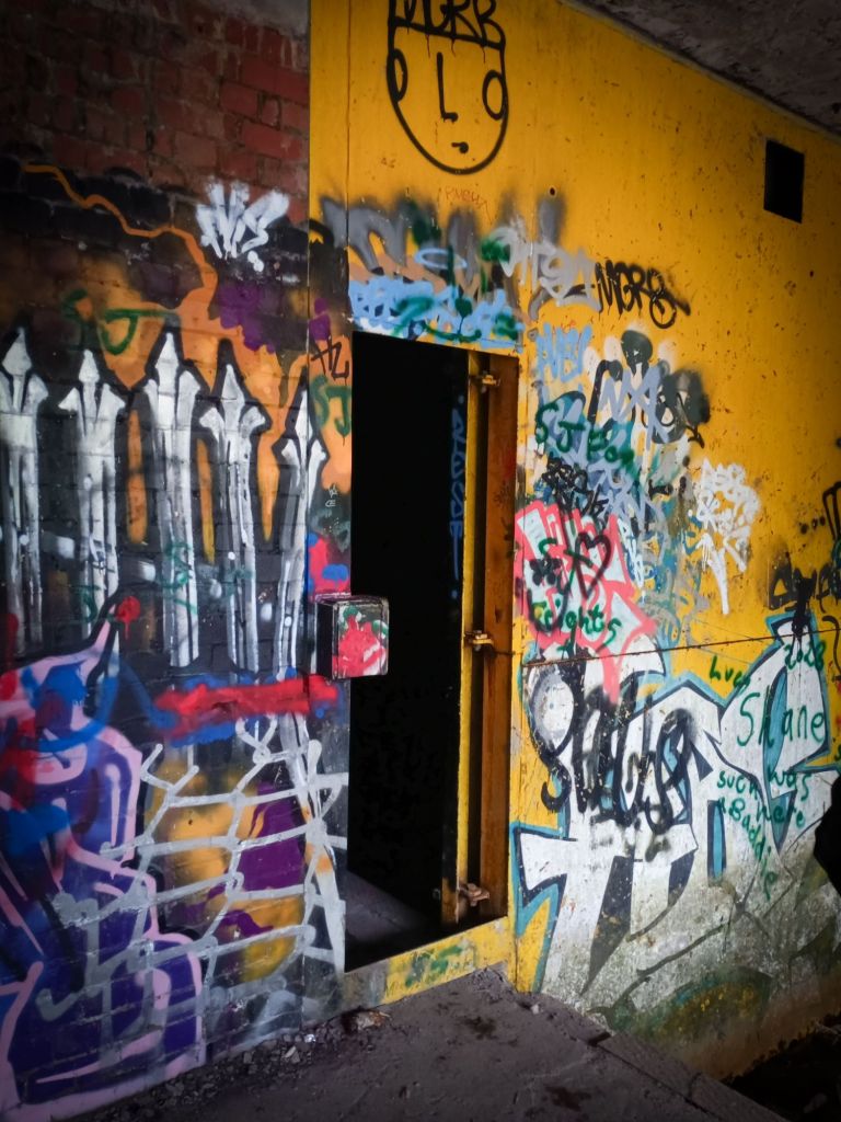 Climbing down a proper hazard of a slope into the facility you get a proper sense of the scale and the possible danger of this being hit with an arial bomb, filled with explosives that would be utterly devastating. You can see the size of the roof collapse also, it’s huge and before long we we are large open area in the centre of the facility would have all collapsed. And that’s where we are standing now, a stood in the vast area where the roof fell in. A sizeable chunk of the facility does still exist at either end however, so we head first to what’s left of the storage area, through a graffitied yellow painted metal door.