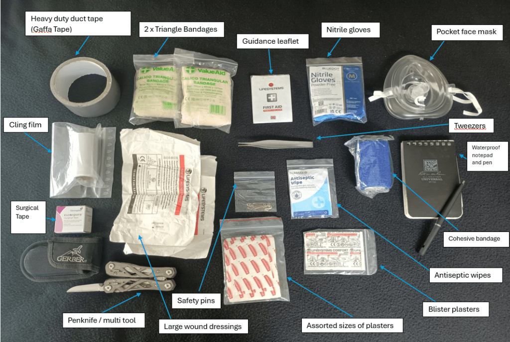 Guidance leaflet: Most people don’t remember everything from their first aid course, if you are lucky you probably won’t have to use it that often however if you don’t get opportunities to practice, memory fades. And even if your memory is amazing, putting things into practice when shit hits the fan is not that easy. It’s always good to have something to remind you when everything has turned into a stress. If you start with a ready made first aid kit keep the guidance leaflet, if not buy one. It could be the difference between your patient going home or not.