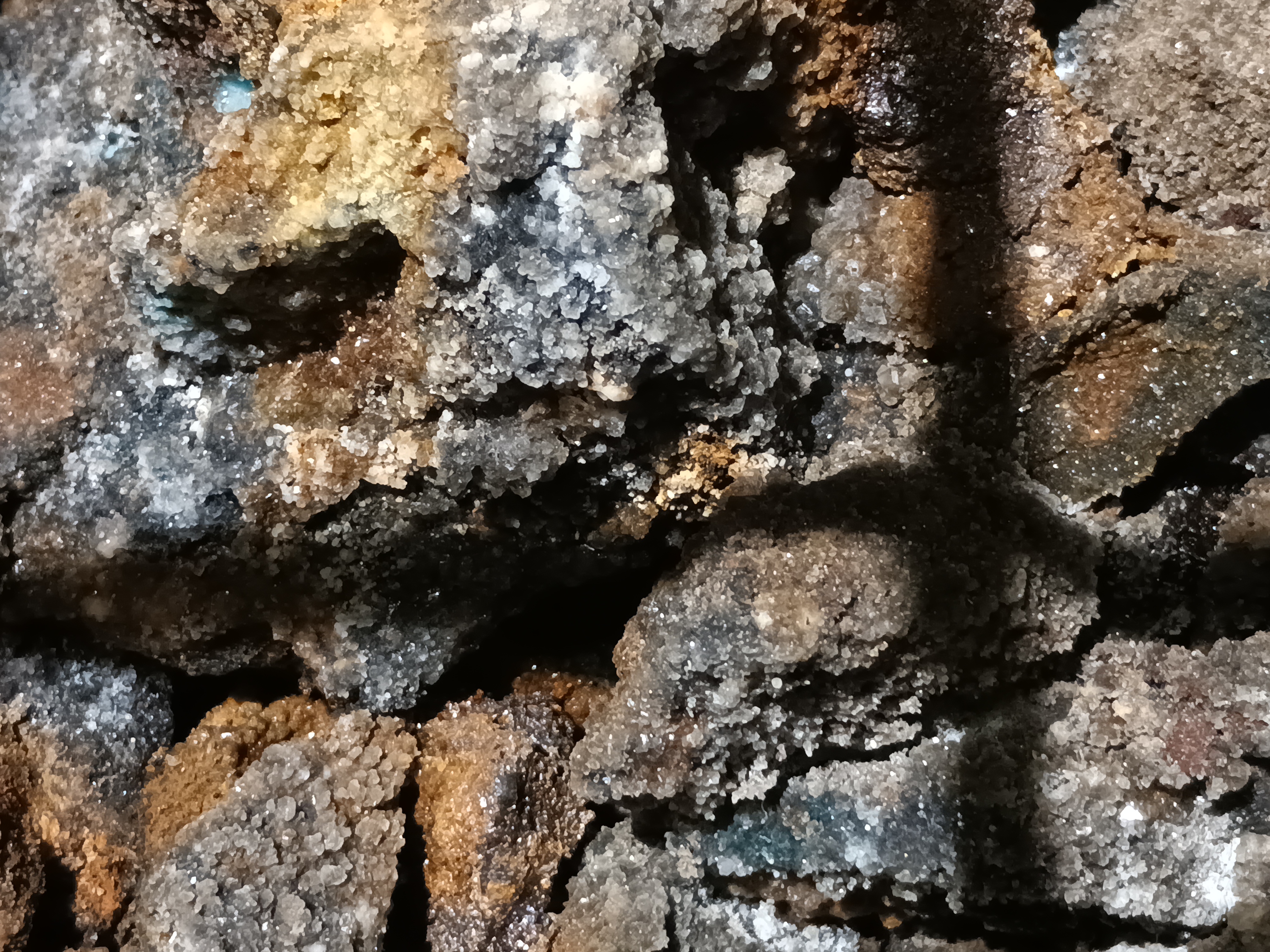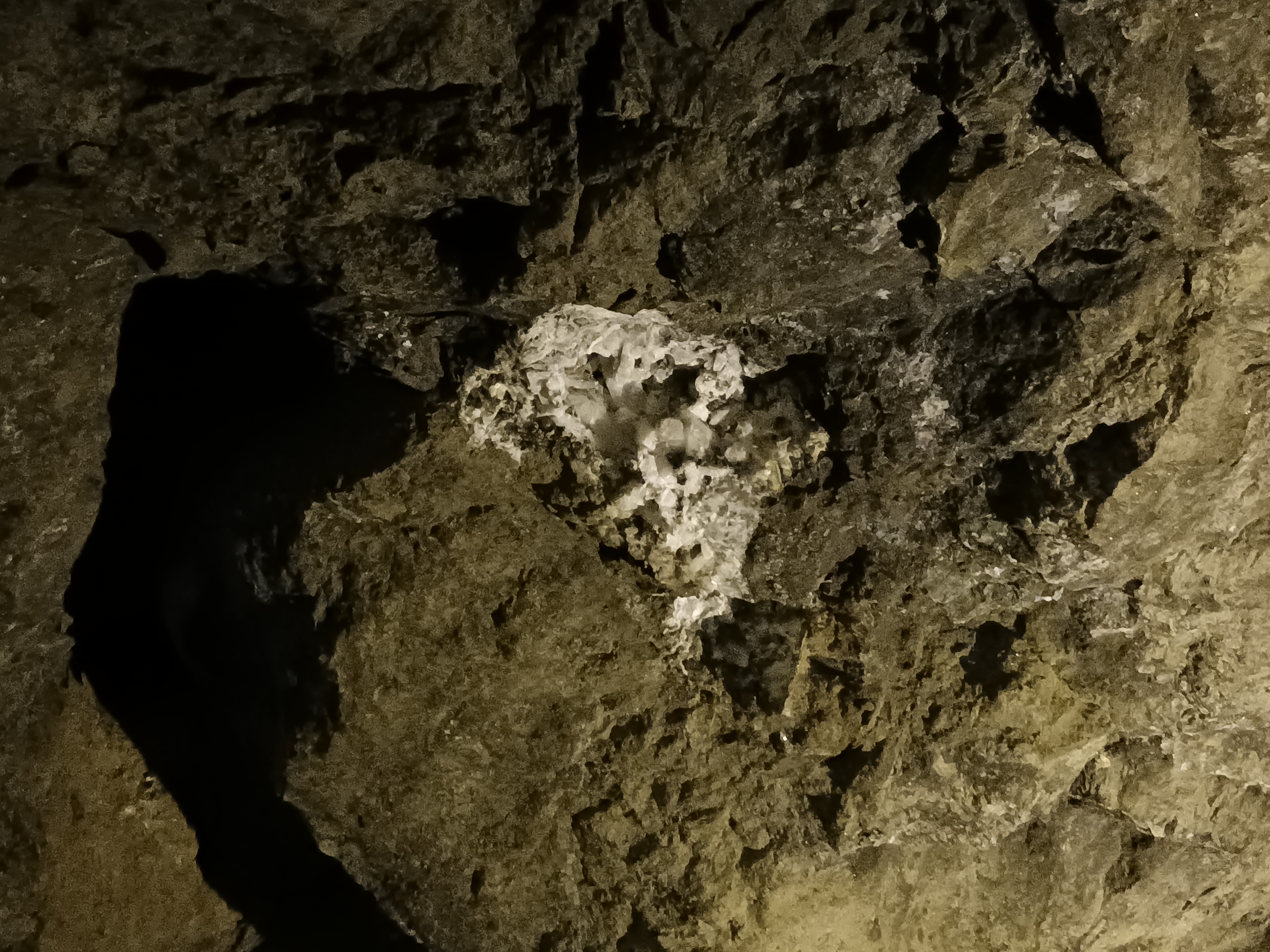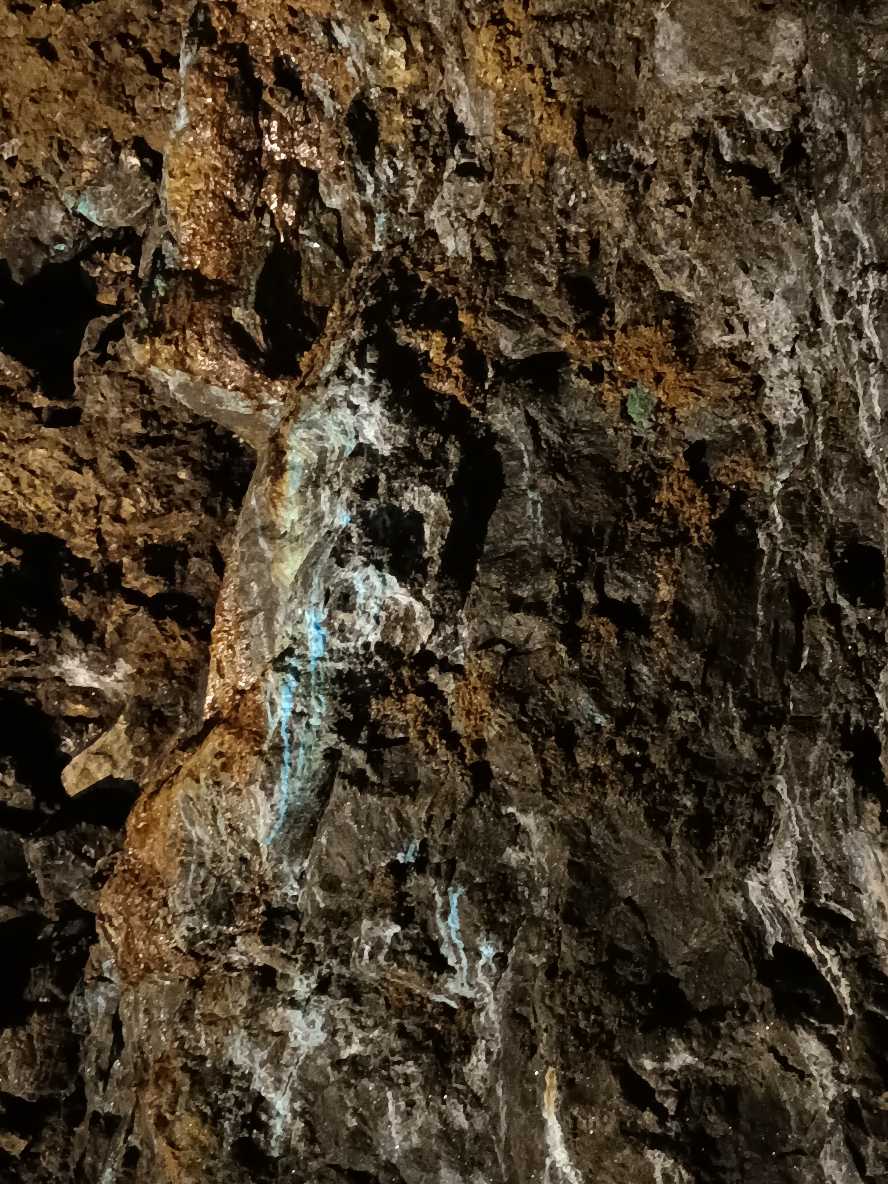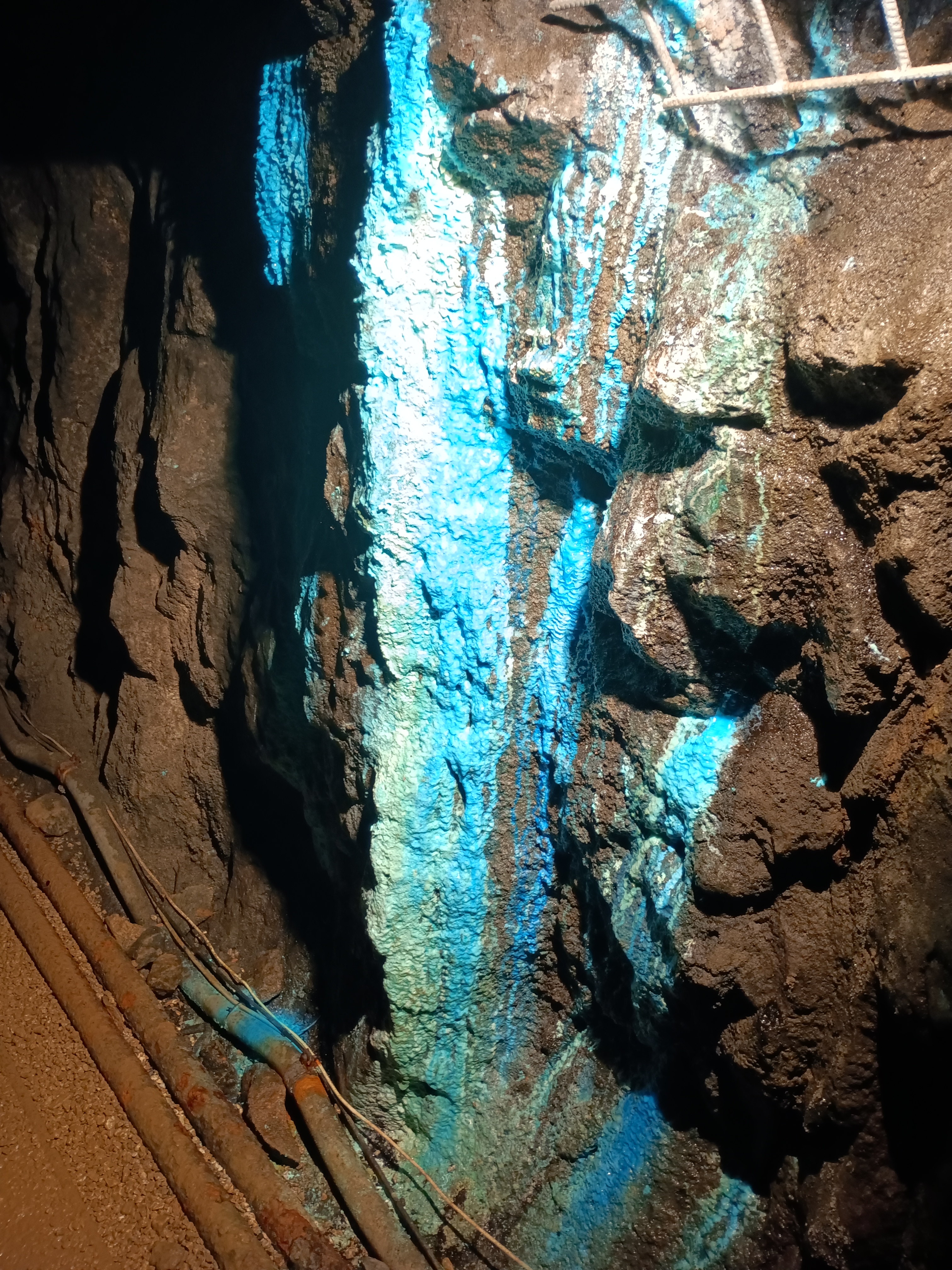 There are examples of ancient and modern mining techniques along the route we are shown in fact this site was operational as recently as the 1970’s and throughout time the Metalliferous mineral deposits here have yielded Silver, Zinc, Lead and Copper. Many examples of crystals and ore can be seen in this mine and are pointed out along the way by the guide. Such as the stunning blue of copper mineral deposits on the walls of the mine passage which is known as chrysocolla, or “gold glue”. Though that sounds like an unusual name the term “Chrysocolla” comes from the Greek “chrysos” (Gold) and “kolla” (Glue) and the term is used as it apparently resembles a substance used to solder gold together in jewellery. This is formed by the combination of copper deposits and water and as we are informed by the guide cannot be touched as this would turn white and the colour would be lost. It’s pretty cool how it looks as if it is spilling out of the wall, which I guess it is, just very very slowly.