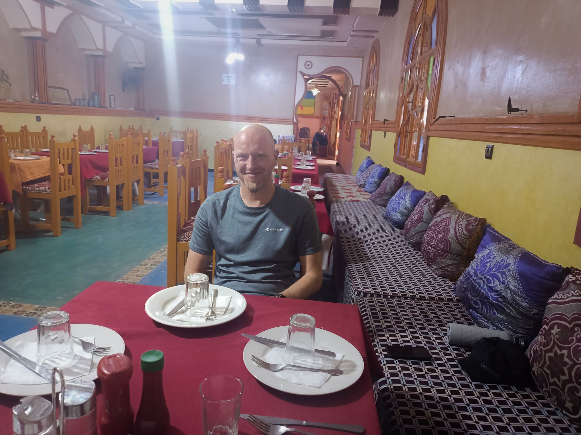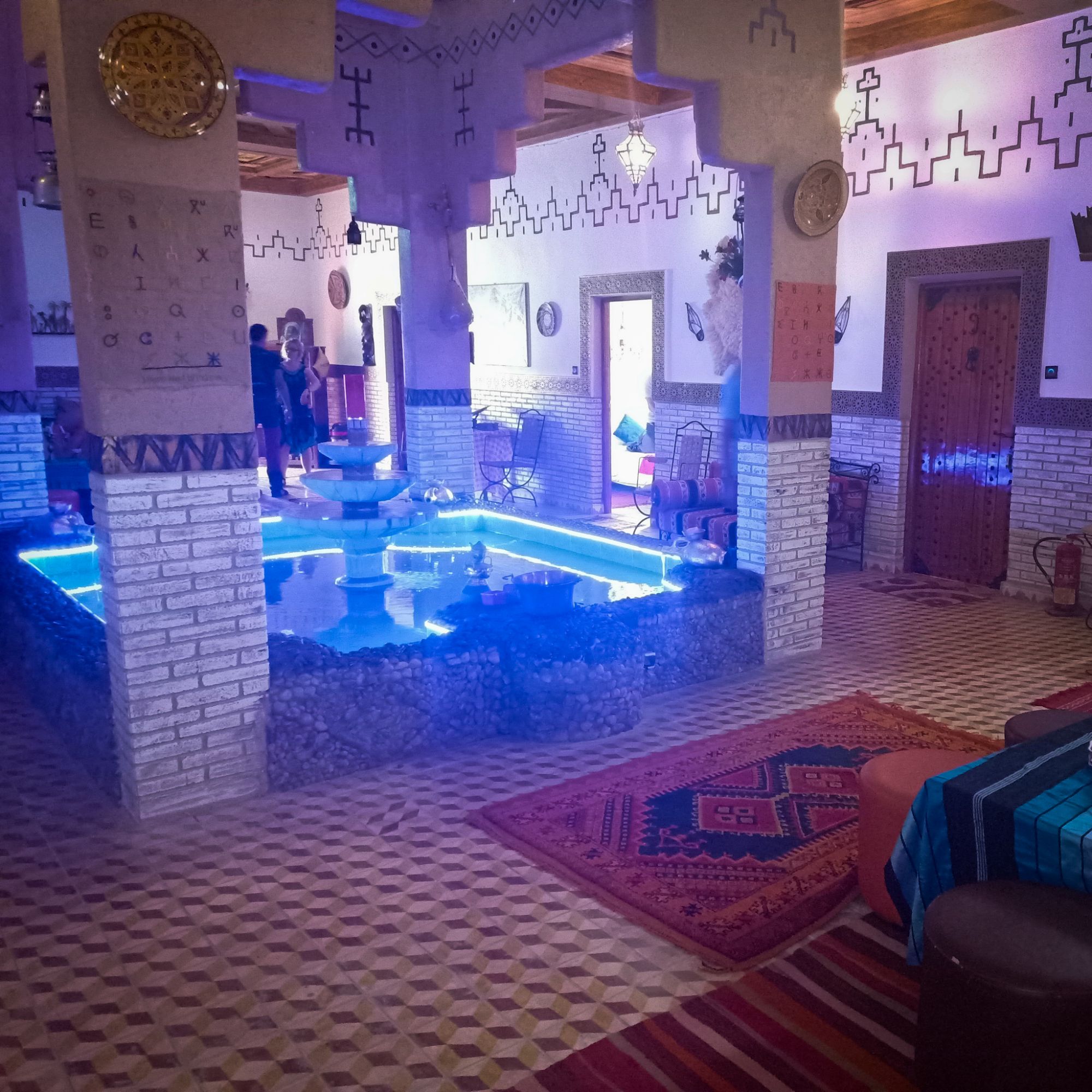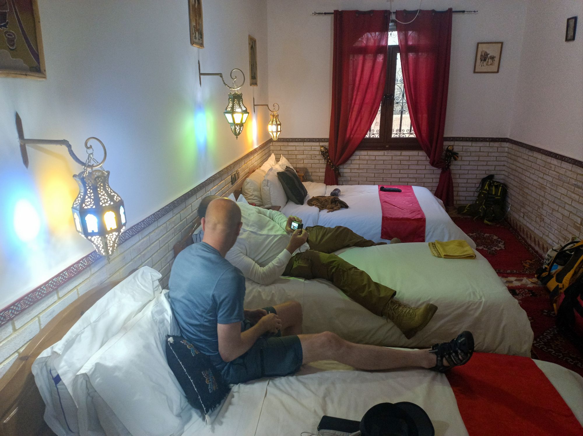 We are relieved when we stop for the evening at the Dar Essyaha Hotel, I shuffle into the lobby the manager seeing me and laughing, making the gesture for using hiking poles with his hands. I’m clearly not the first person he’s seen pass through here who ascended Toubkal first. He greets us warmly and the staff show us to our room which considering our budget is very nice. The hotel looks almost palace-like inside and is full of Berber symbols, outside a balcony runs around the edge of the hotel looking out over the gorge with some amazing views and they even serve beer which is great after a long day. I’d love to come back this way again and see more of the Dades region and if I did I would definitely stay here again, it’s a lovely place and a nice bit of luxury after hiking up Toubkal and sleeping in dormitories on previous days.