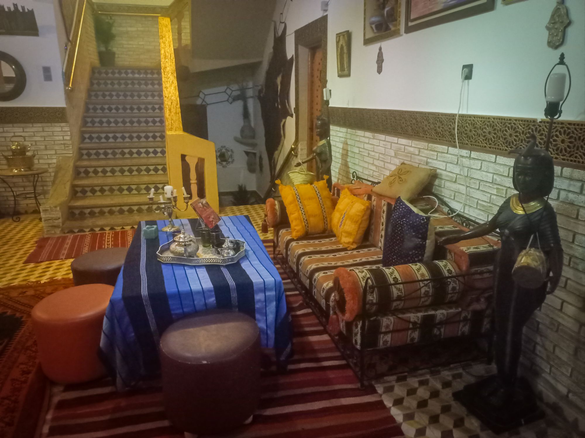 We drive through more arid landscapes occasionally broken by small traditional villages before our taxi driver stops at a roadside stall selling all sorts of Moroccan trinkets. None of us really want anything but to stretch our legs however the seller actually goes as far as to wrap us in the traditional headscarves he is selling and we just give up resisting and say we will have them. He shows us how to wear them correctly and starts rapidly wrapping us up like Egyptian mummies but lets me honest here we look like a bunch of dickheads, like someone ordered Lawrence of Arabia from Temu. These suit the locals way better than they suit us, and there’s no way they are worth what we pay for them. He also manages to sell me some jewellery though I pass at the one for protection for the evil eye, because at this point I’d quite like an amulet of protection against salesmen! Later we stop again for a short moment in one of the gorges, take in the immense steepness of it and watch the many goats pass us by before our driver tells us he is taking us somewhere to have some tea.