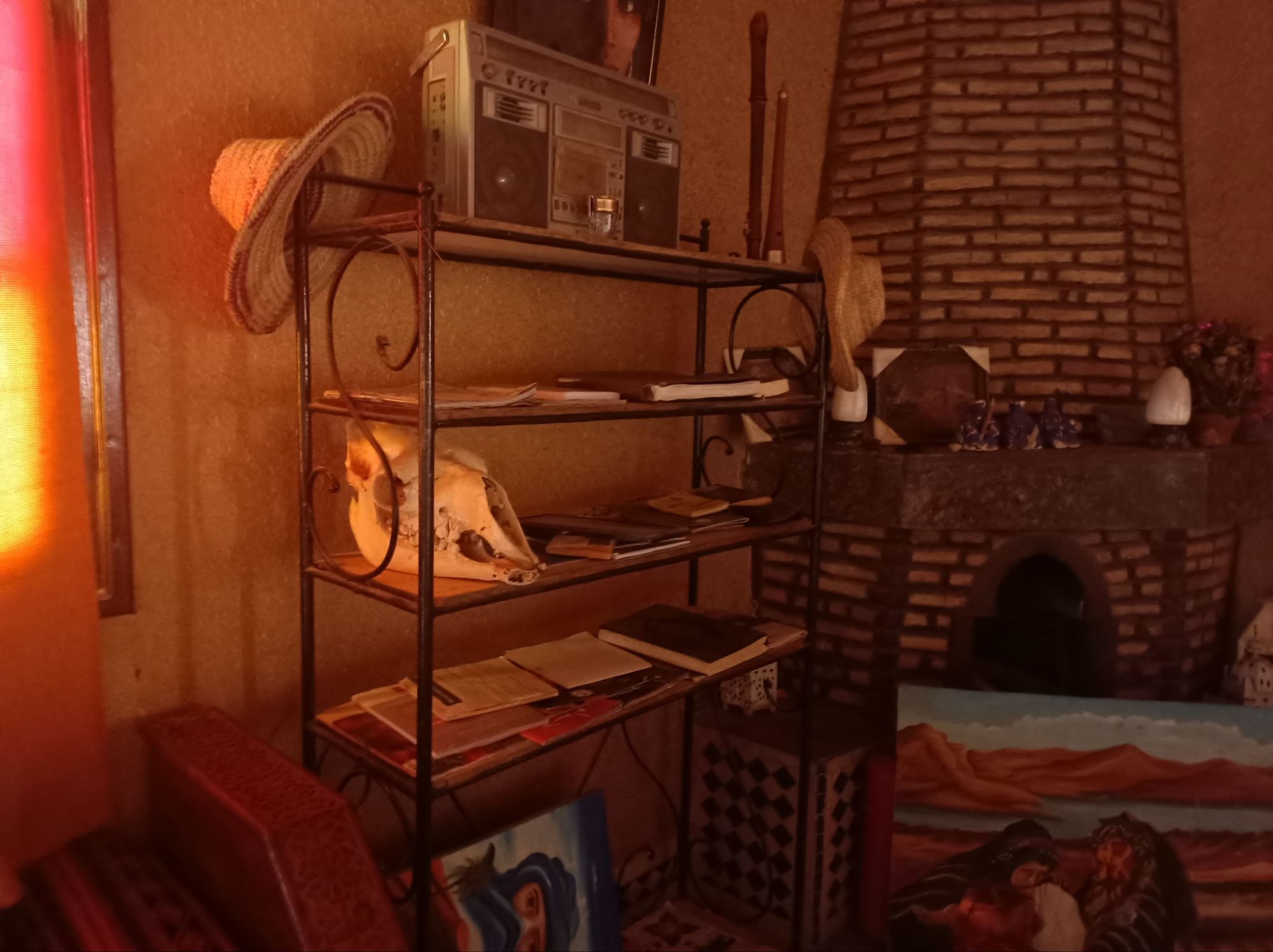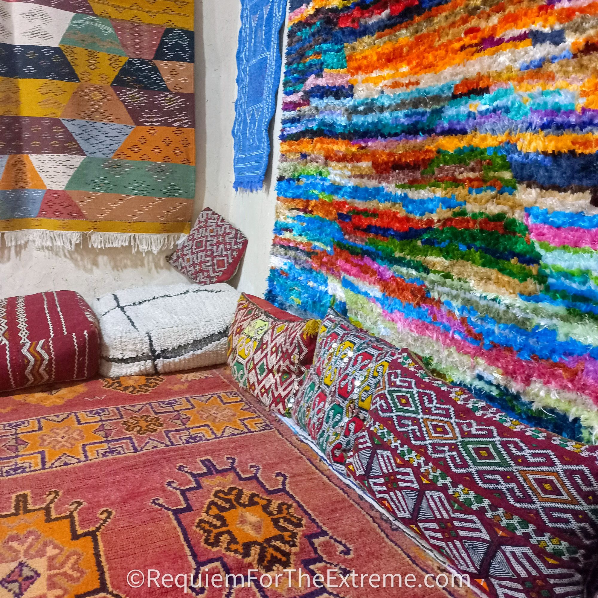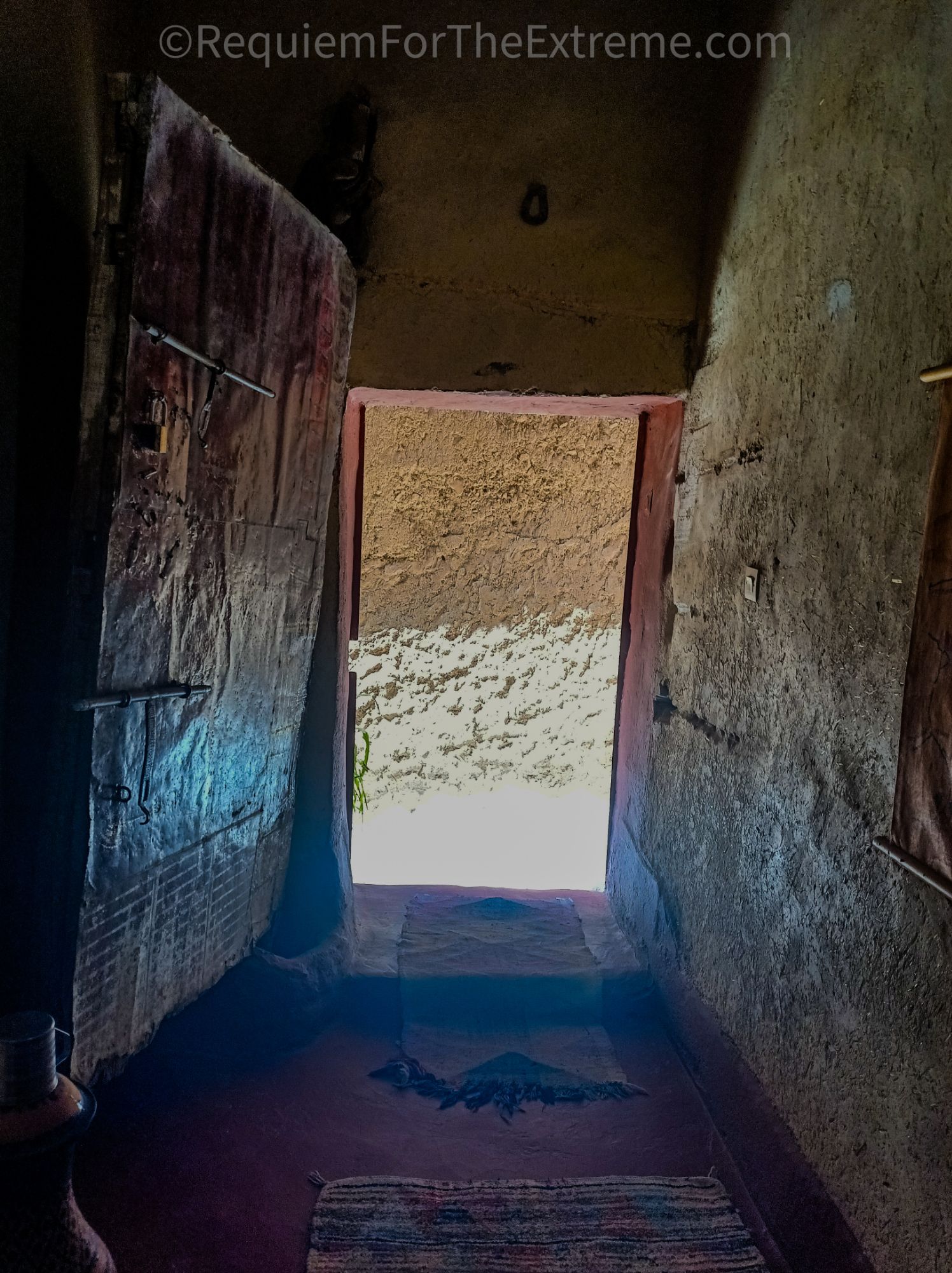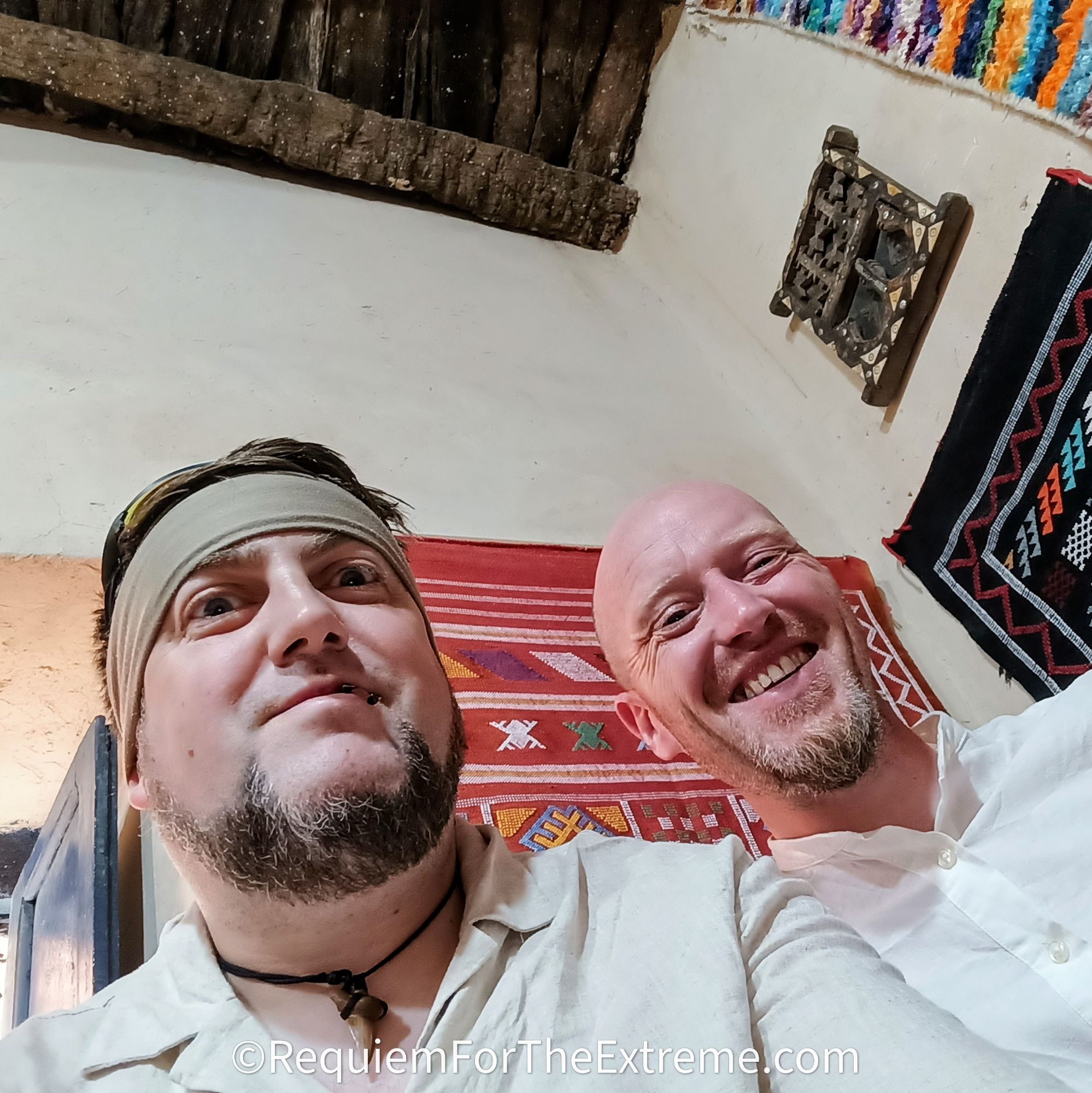 Pulling up outside some traditional mud buildings we follow our driver to and down a long mud staircase. This is a struggle for me still so it isn’t ideal though eventually I limp and hop down the steps in my desert boots, the mud lightly vibrating which is a weird feeling underfoot and pass through a wooden door into a courtyard where we are greeted by a Berber fella with a shaved head who welcomes us into the building through a large wooden door that looks like it was made a thousand summers ago. He asks where we are from and we exchange a few pleasantries before he leads us upstairs where Berber women await who are sent off to make tea for us. We are asked to remove our shoes and we enter a large room that appears to be covered in carpets. Our host motions for us to seat ourselves on the floor which seems to be a Berber thing which considering the nomadic heritage isn’t too surprising. I guess having lots of furniture isn’t very practical if you move around a lot.