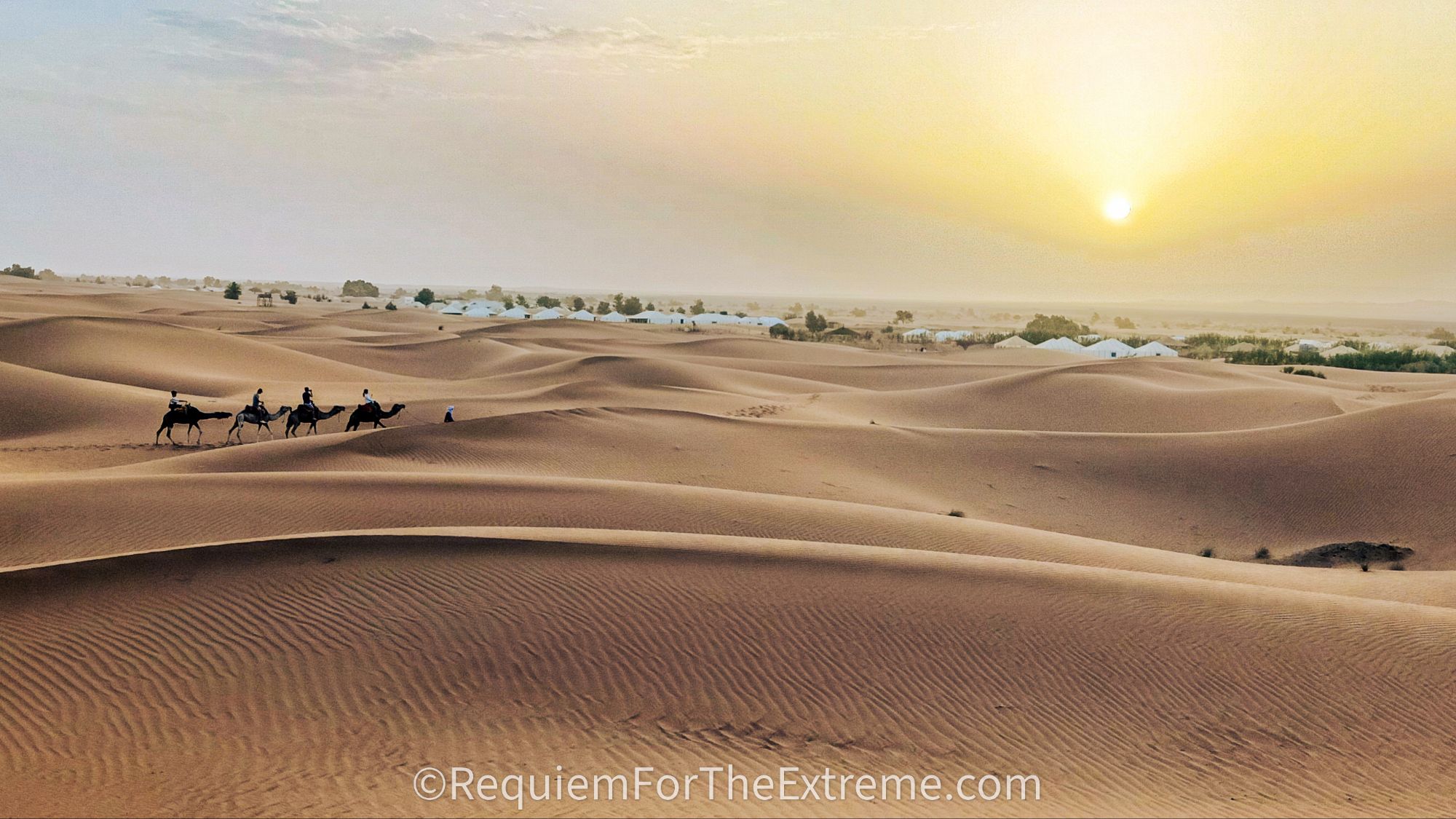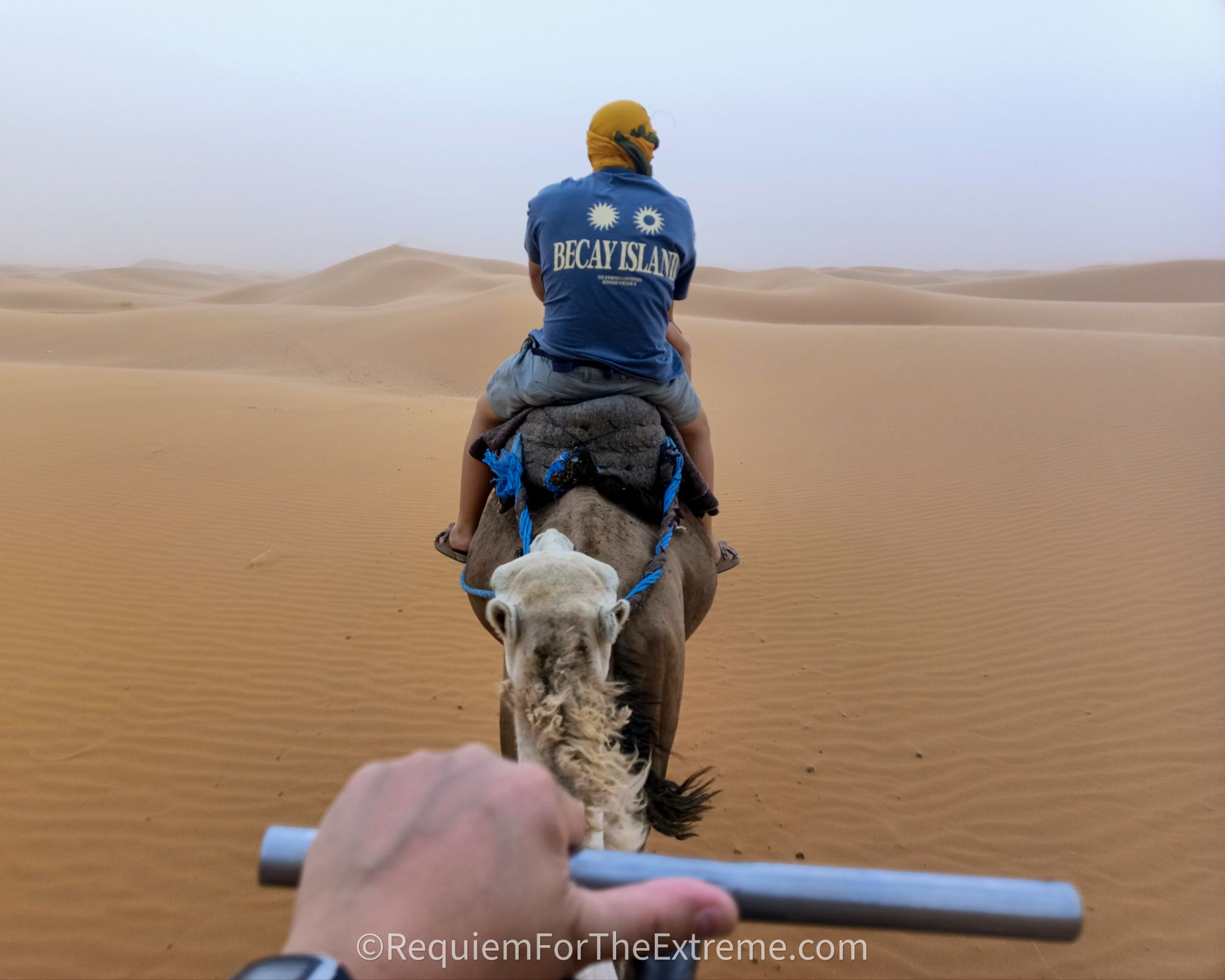 When I’ve finished embarrassing my camel I finally managing to get on it, when the handler gives them all a command to rise. I’m glad I’m holding onto the big metal handle on the saddle that distinctly reminds me of the handle you’d find on a kids seesaw because a spilt second later Sandy (the camel) stands up and I find myself at a 45 degree angle above the sandy ground then sat straight again about two metres in the air. Falling off at this point wouldn’t be good because falling on sand is like hitting a brick wall, so I make a conscious note not to piss Sandy off. Trotting towards the desert led by the guide the hamada gives way to sand and apart from the wind it is strangely quiet, the silence only broken by the occasional heavy ‘bomf’ noise of a camel hoof and grunt. There’s an otherworldly feeling as as the dunes stretch out in all directions, a vast sea of sand as far as we can see. It starts to slowly sink in that we are now part way into the largest hot desert in the world, putting our trust in a lone camel train leader we don’t even know. The wind and sand aggressively whistles around us highlighting exactly why we all decided to wear face coverings, I’m still in shorts though so I’m still getting a brutal exfoliation anyway. The camels are tied closely together and for some reason the Spanish speaking fella in front of me decides it’s a great time to start patting the head of my camel as we move. I’d tell him to stop, because if the animal doesn’t like this it’ll be me that gets thrown, but the wind is way too loud for anyone to be heard, luckily ‘sandy’ doesn’t seem to mind, in fact doesn’t seem to even register this. I decide maybe I should try bonding a bit being as It’s carrying my fat ass into the desert and stoke it’s head a bit, having never done this before I could describe it as not too far off how it feels touching the scouring bit on the back of a washing up sponge.