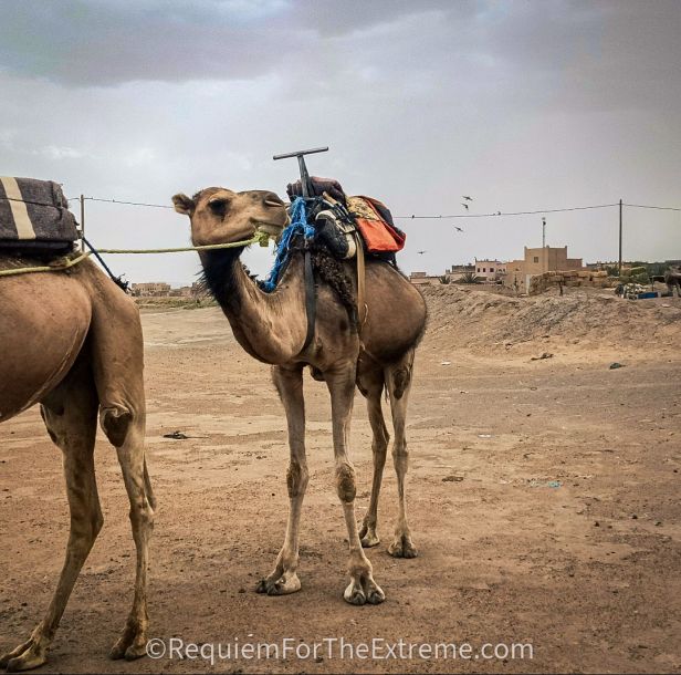 When we return to join Rob at the hotel reception the manager rises, announcing ‘we are going’ and leads us to a 4×4. Getting into the vehicle my first thought is of how anything mechanical survives in a place this dusty, I half expect a small sandstorm to whip out of the vents when he puts the A/C on. We take a bumpy ride to where the camel handlers and a group of unimpressed looking camels wait. I suppose camels always look unimpressed and bored, I probably would if I just stared at sand all day. We share an apprehensive look as the camel handler in his long robes and headscarf gets the line of camels to begrudgingly kneel on the ground for us to climb on. Andy’s camel seems very grumpy even though it has the best deal as Andy weighs hardly anything. Despite this he still manages to get on it without many issues besides noises of protest. Rob has no issue with his either so I think I’m going to be the unlucky one, it turns out however the camel isn’t the issue it’s me. After the Toubkal hike I’m still proper seized up and I struggle to get my leg over my camel who I’ve already mentally named sandy. In fact I’m so mullered that I have to grab my right leg that is refusing to bend all the way and lift it over the humps and I have to laugh because the situation couldn’t be any more ridiculous. Desert rat I am not, maybe something else that rhymes with that.