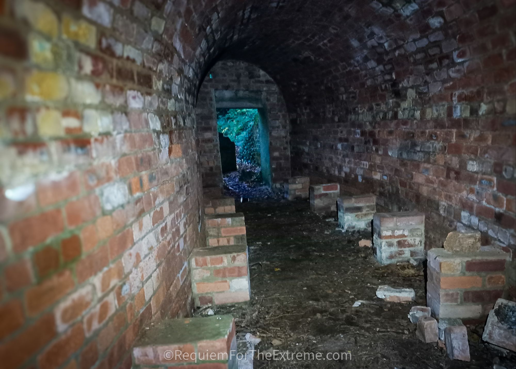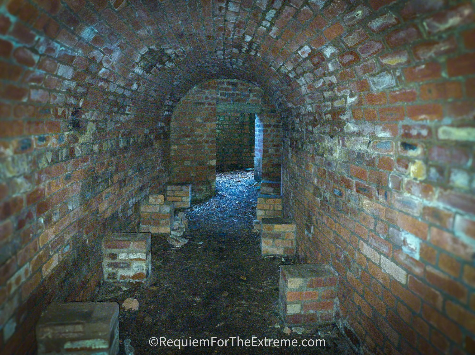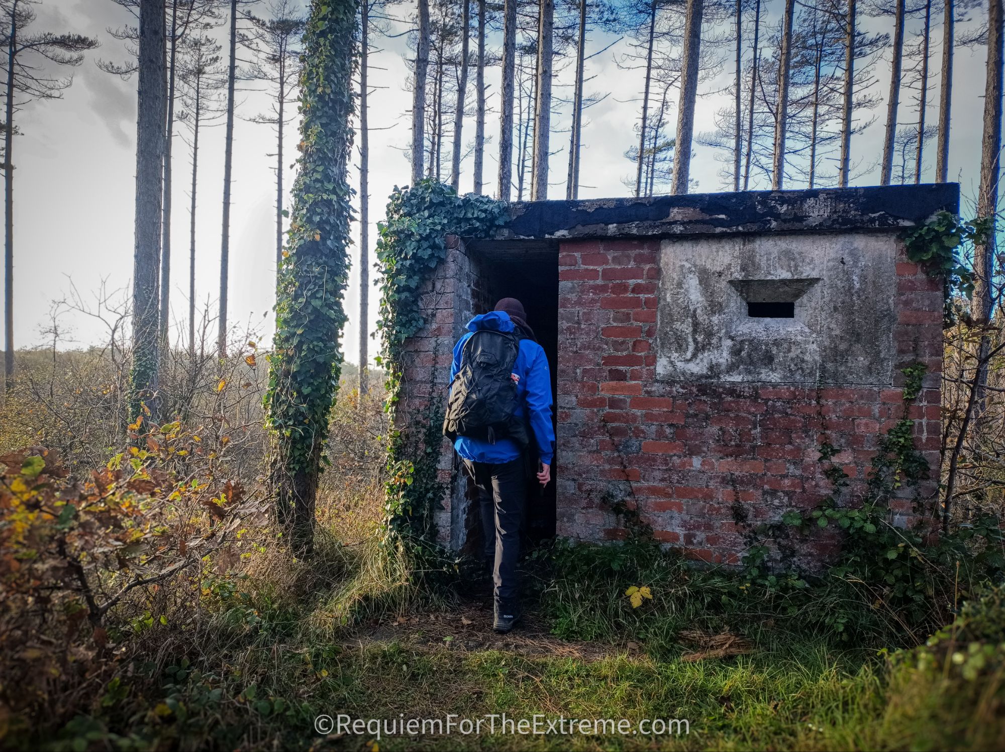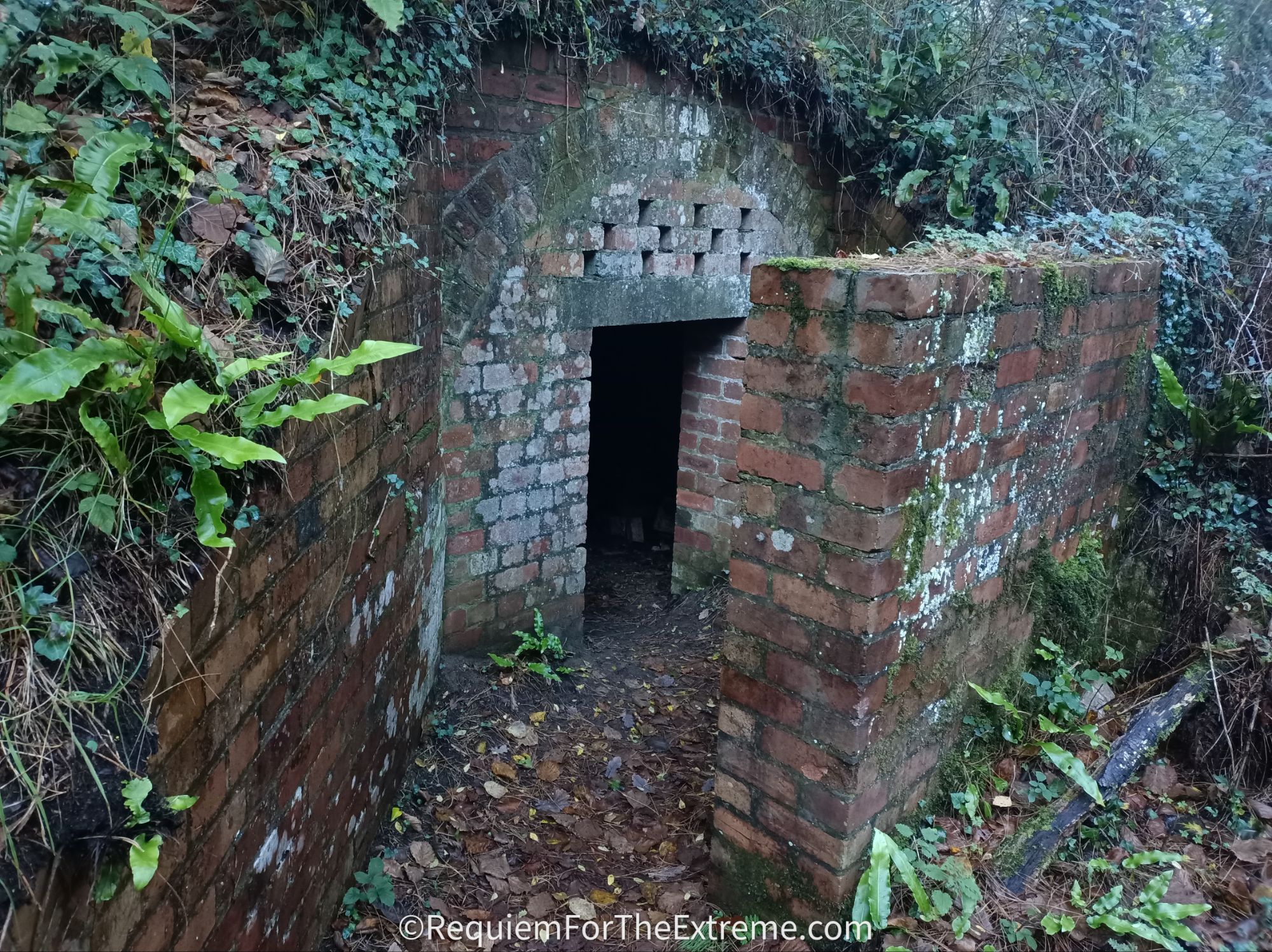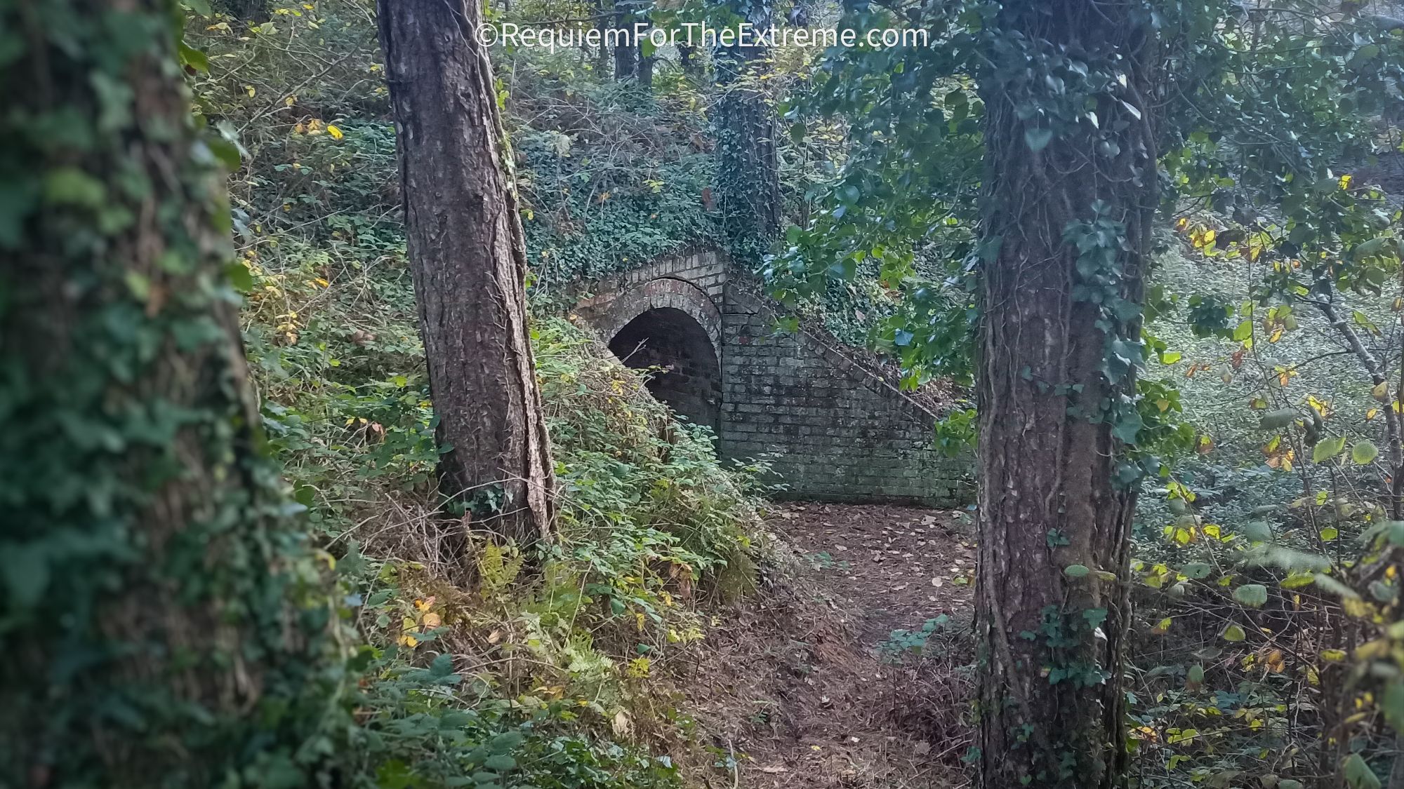 I stop for a short break and while I’m parked up my phone buzzes and I find out one of my mates isn’t coming as he’s been called into work and the other is going to arrive here late so I decide I’ll go straight to Pembrey Forest to explore by myself in the dark before he arrives. When I pull up in the car finally I start to get my gear together while noticing the owls have begun hooting up in the trees and I chuckle to myself about the already spooky atmosphere before marching off into the park. While this isn’t one of my usual extreme adventures it can’t all be hanging off mountains and stuffing myself down caves so why not relax by hiking around the haunted woods on Halloween instead, perfectly normal. As I’ve already alluded to this area has quite a history, Pembrey Country Park was originally the site of of many successive ordnance factories. Buildings manufacturing explosives were situated in the sand dunes or ‘burrows’ to provide cover and to minimise damage in the event of a detonation. The first factory here was built by the Stowmarket Explosives company which went into receivership in 1885 to be replaced by the South Wales Explosives Company. Following this in 1914 after the outbreak of WW1 the Nobel Explosives company built a factory here, the company of the very same Alfred Nobel who began the Nobel Peace Prize. Considering Nobel became incredibly famous and rich for creating not only dynamite but also smokeless gunpowder the irony is far from lost on me. Nobel’s factory began winding down in 1919 and the equipment was sold for scrap in 1926. The remaining admin buildings were used as a school camp for the children of unemployed miners during the 1930’s. When WW2 begins the site has a new factory ‘The Royal Ordnance Factory Pembrey’ built which continued to operate until 1964. The site finally became Pembrey Country park in 1980 . As I walk deeper into the park one of the first features I come across is the tunnels, one of which appears to my right across the neatly mown grass, looking quite out of place and I head over to it unable to curb my enthusiasm. In the fading light it’s easy to see why people find these old brick tunnels a bit spooky, now covered in creeping undergrowth their dark mouths leading into the round dugouts in the sandy soil.