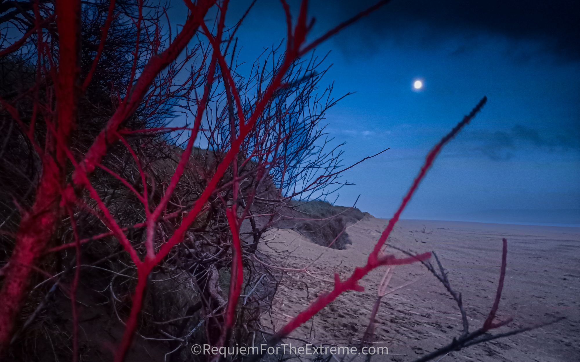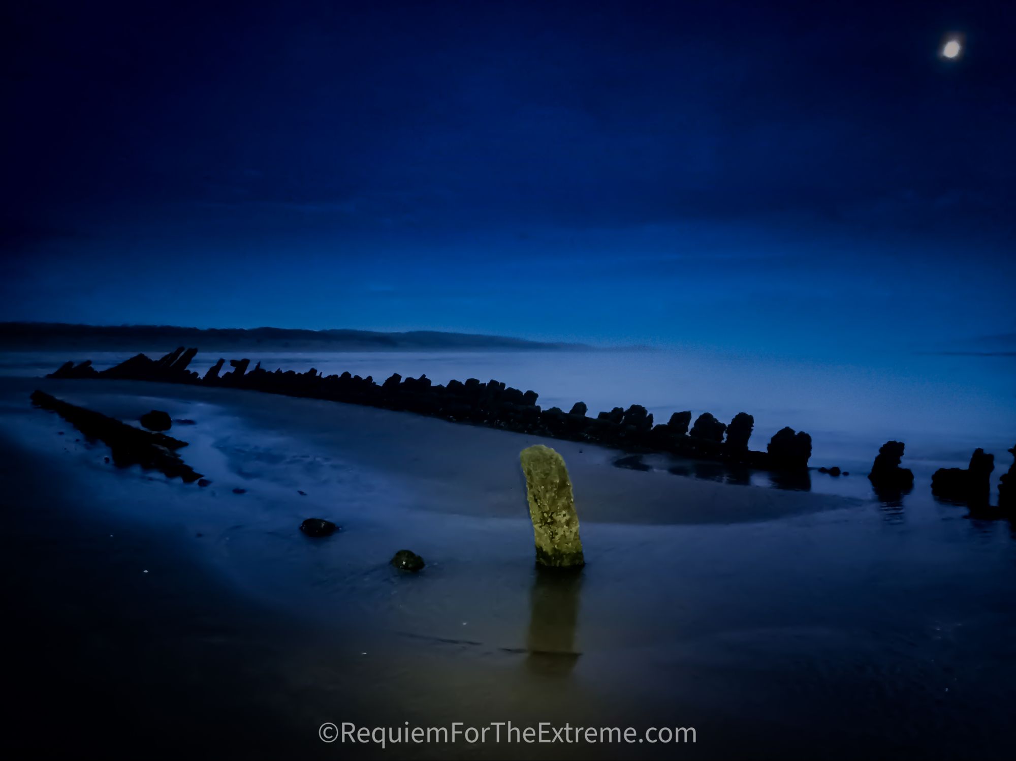 The moon is shining in the sky as I take pictures of the remains of the Paul, out on the sands apparently with it all to myself. Not that this is a problem as there’s nobody with torches to ruin my shots. With so many ships wrecked here of course the beach has it’s own spooky tales such as a sighting of a spectral ship off the coast in the area with a ghostly green glow. These sort of ghost ships feature heavily in maritime folklore the most famous being The Flying Dutchman. The most enduring tale of Cefn Sidan is not the spirits of ships or their crews but the spirits of those known as ‘The Little Hatchet Men’. The Gwyr-y-Bwelli bach or ‘the people with little hatchets’ were a real group of wreckers and so named for the small hatchets that they used in the stripping and robbing of wrecked ships. They were most active in the hundred years between 1770 and 1870 and there are many tales involving them however it’s difficult to separate the truth and folklore. The hatchets were used to break into cargo such as crates and barrels and reportedly for the removal of rings from the hands of the dead. When the body of Adeline, Niece to Napoleon Bonaparte’s consort was found having been one of the victims of the 1828 shipwreck‘La Jeune Emma‘ her body was missing two of its fingers. With this in mind I turn back inland in the direction of the dunes as I’ve been out here in the dark for two hours now and my mate should hopefully be arriving at our AirBnB soon. Not just that but I need to avoid the rising tide that comes in quickly here of Cefn Sidan. On my way I pass the ruins of what looks like an old WW2 gun battery or observation point with the sand dudes now pouring through it making it look like a concrete mouth vomiting sand onto the beach. I turn around wondering if ghostly figures have followed me across the beach, of course there’s nothing there but the bright moon mirrored in the thin layer of wet sand bordering the oncoming waves and the wind howling.