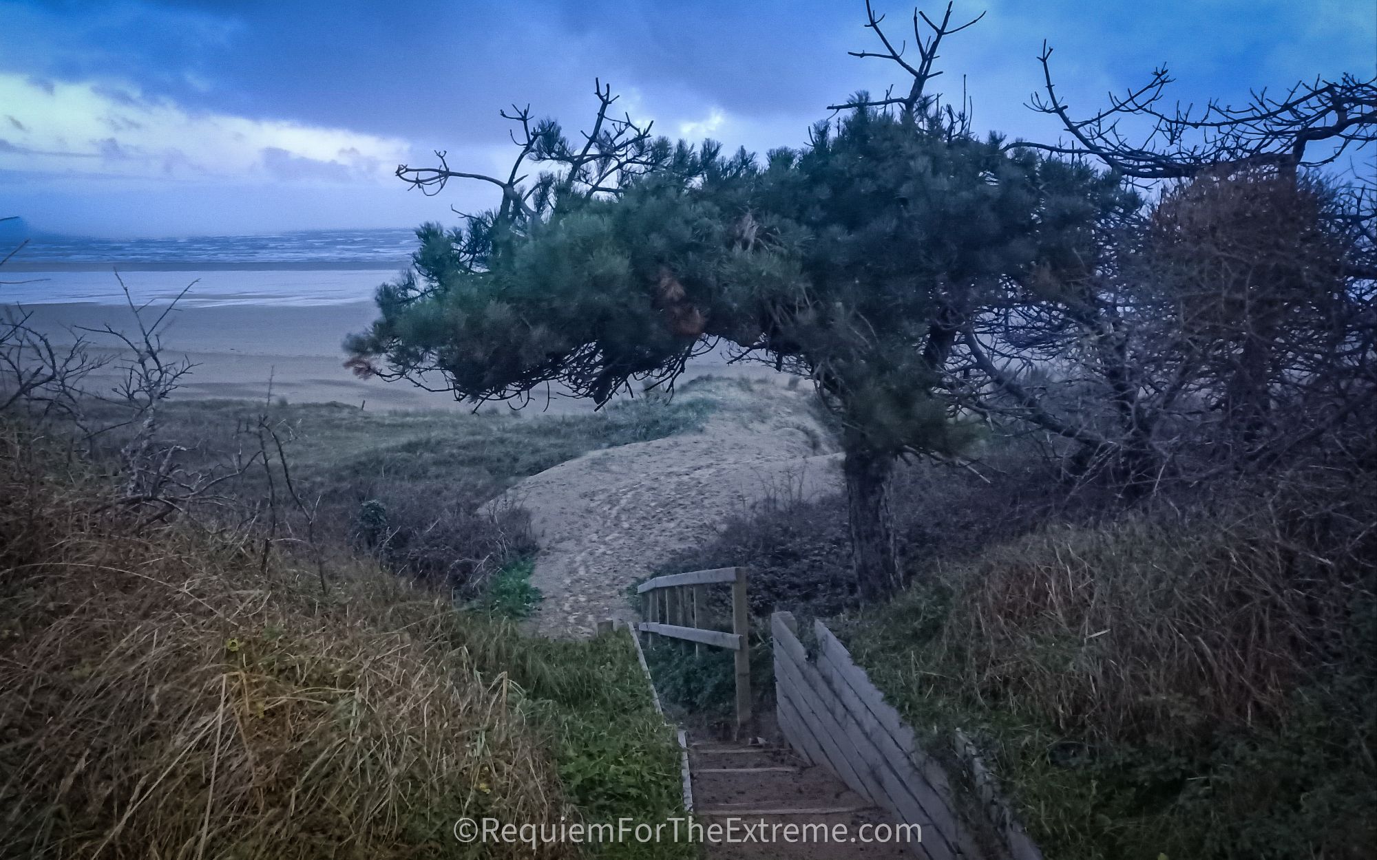 Leaving the old structures I head through the woodland towards the sea hoping to get some atmospheric photographs in the fading light. The walk through the woods seems to go on forever like strange daydream, there’s nobody around and all I have for company is the distant roar of waves of the Bristol channel. The atmosphere is eerie as I exit the woods and approach the dunes, the sky now a deep bruised colour in the finality of the autumn sunset. In the dusk I head over the dunes the sand gently crunching below my feet, just audible in the increasing wind. Then I drop down past gnarled trees and shrubs, battered by the Welsh weather onto the extensive sands of the beach, Cefn Sidan which means apparently ‘Silken Back’ quite a nice name really considering it’s other name is ‘The Dustbin of the Atlantic’.